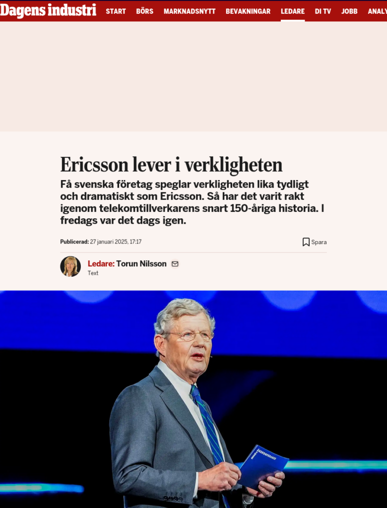 https://www.di.se/ledare/ericsson-lever-i-verkligheten/ "Ericsson lever i verkligheten Få svenska företag speglar verkligheten lika tydligt och dramatiskt som Ericsson. Så har det varit rakt igenom telekomtillverkarens snart 150-åriga historia. I fredags var det dags igen. Publicerad: 27 januari 2025, 17:17 Ledare:Torun Nilsson MARKERAR. I söndags markerade Jacob Wallenberg sin makt över Ericsson i SVT Agenda när han försvarade donationen till Donald Trumps installation och försäkrade att huvudkontoret blir kvar i Sverige. Först föll kursen med hela tio procent, för att placerarna var besvikna på rapporten. I söndagens Agenda slog Jacob Wallenberg fast att huvudkontoret ska vara kvar i Sverige, sedan vd Börje Ekholm antytt att det kunde vara på väg till USA. Samtidigt försvarade Wallenberg Ericssons ERIC B +1,20% donation till Trumps installation i förra veckan. På måndagen föll kursen till att börja med ytterligare mer än tio procent, när allt kopplat till AI-teknik rasade för att Kinas Deepseek lanserat en ny energisnål AI-modell. Men placerarna fick tillbaka modet. Pang, boom, chock, alltså. Ericsson är alltid i skärningspunkten mellan stormaktspolitik, ny teknik och börs. Så var det när Kreuger kraschade 1932 och Jacobs farfar Marcus fick förhandla i flera decennier för att få tillbaka ägarmakten som Kreuger sålt till amerikanska ITT för att rädda sitt skinn. Vid millennieskiftet gick Ericsson nästan under sedan västvärldens politiker förköpt sig på nytt frekvensutrymme för att få plats med den tekniska nyheten internet. I slutet av 2000-talet körde kinesiska konkurrenten Huawei nästan livet ur Ericsson. ”Det är tur att verkligheten hunnit förändras även för svenskt entreprenörskap.” Skillnaden den här gången är att Kina redan är en stormakt, AI rusar och börsen drivs av globalt fondkapital. Det är tur att verkligheten hunnit förändras även för svenskt entreprenörskap. I dag får Huawei inte längre sälja i USA. Därmed är Ericsson åter herre på täppan och för första gången stort i USA. Där fick inte Ericsson plats förr i världen, bredvid de amerikanska telekomleverantörerna. Nu är problemet i stället att AI-jättarna lagt beslag på förädlingsvärdet med appar, molntjänster och liknande. Därför har teleoperatörerna mindre pengar att köpa utrustning, särskilt de europeiska som är för många och små. Till råga på allt har Ericssons försök att bredda sig med nya produkter misslyckats, i alla fall hittills. För tillfället framstår Ericsson som ett moget företag, snarare än ett tillväxtbolag. Lite som toapapper, snus och choklad. Geopolitiskt är läget svårare än på länge. I Kina levererar entreprenörerna teknik som är så bra att den ställer till med börsras i väst. Eftersom prestationerna sker trots att Kina är en diktatur är de svåra att förhålla sig till. Hur länge till kommer kinesiska entreprenörer att orka när de aldrig kan vara säkra på att få behålla sina vinster? I USA bestämmer den oberäknelige Trump. Det är detta som är Ericssons nya verklighet. Problemet för Sverige är att även huvudägaren familjen Wallenbergs vardag förändrats. Förr i världen kunde Jacobs farfar Marcus bestämma nästan själv. I dag är kapitalet globalt och familjen Wallenberg tvungna att rätta sig efter den internationella börslogiken. Trump har redan visat att han gärna vill ha makt över strategiska tillgångar, som Grönland. Det är mycket möjligt att han vill lägga beslag även på världens största telekomproducent som snart ska börja sälja 6g. Hjälper han något amerikanskt företag att lägga ett tillräckligt högt bud lär familjen Wallenberg få svårt att säga nej, med tanke på sina egna aktieägare. Det är mot denna bakgrund man ska se Jacob Wallenbergs framträdande i Agenda. Genom att slå fast att huvudkontoret ska vara kvar i Sverige markerar han makt och därmed pris. Samtidigt passade han på att lugna de anställda när det gällde donationen till Trump. Det var en gåva, given helt öppet, nödvändig för att få till en dialog med de nya amerikanska makthavarna. Förutsatt att detta stämmer finns det inget att invända. Kanske kan Jacob Wallenberg och Ericssons styrelse hålla emot Trump tills 150-årsjubileet är över. Vad som därefter händer kan ingen veta. Vi får trösta oss med att verkligheten ändrats även för allt annat ägande, och att Sverige åter har en mängd nya snabbväxande teknikföretag. Allt hänger inte längre på Ericsson."
