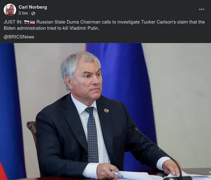 Chairman of the Russian State Duma Vyacheslav Volodin - on why what Tucker Carlson said should be taken seriously: "Yesterday, American journalist Tucker Carlson said that the Biden administration “tried to kill Putin.” This was proposed by former US Secretary of State Blinken. A day passed. Everyone is silent. Neither Biden nor Blinken denied the statements. The preparation of an assassination attempt on Putin, the very discussion of it, is a crime . The most serious threat to global security. A direct path to the start of a nuclear war. This should be grounds for investigation by all international institutions. Let me give you some facts: - Preparations were underway for an attack on Hungarian Prime Minister Orban, which was avoided. - An assassination attempt was made on the Prime Minister of Slovakia Fico . - An assassination attempt was made on Trump during his election campaign. Therefore, discussions of the intention to kill Putin must be taken seriously. All these are links in the same chain. What Tucker Carlson said needs to be thoroughly investigated. And Biden and Blinken are held accountable. We all need to realize that the Russian Federation is being subjected to a brutal fight. We need to understand the scale of the challenges and threats that we face. And that means feeling your responsibility. Vladimir Vladimirovich is doing everything to strengthen the country, achieve peace and resolve issues of global security. Putin is undoubtedly Russia's advantage. Today, more than ever, unity and consolidation of everyone around our President is extremely important."