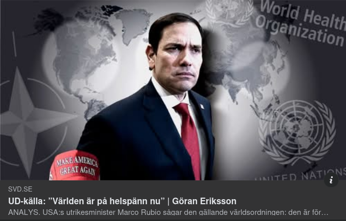 https://www.svd.se/a/nyn8EB/donald-trumps-utrikesminister-marco-rubio-sagar-varldordningen "USA:s utrikesminister Marco Rubio sågar den gällande världsordningen: den är föråldrad och har blivit ett vapen mot USA. Markeringen väcker oro i Stockholm: ”Hela världen är på helspänn nu”, säger en UD-källa. – Efterkrigstidens världsordning är inte bara föråldrad, den är nu ett vapen som används mot oss. Så sa USA:s nye utrikesminister Marco Rubio när han frågades ut i senaten inför sitt tillträde. Rubios ord signalerar en radikal förändring av USA:s roll i världen. Budskapet är oroande för många europeiska huvudstäder, inte minst Stockholm – är det den existerande världsordningens undergång? – Det är klart att detta har noterats och analyserats. Hela världen är på helspänn nu, ingen vet vilken riktning Trump-administrationen kommer att ta, säger en svensk UD-tjänsteman. Rubios kritik handlar mindre om traditionell säkerhetspolitik, och mer om hur en långtgående liberalism tilläts genomsyra västvärlden efter Sovjetunionens fall. Fri handel och öppna gränser har orsakat problem – industrikris, massinvandring, trafficking och knarkhandel – som i dag utgör hot mot USA:s säkerhet. – För vårt land har det aldrig varit mer relevant eller mer nödvändigt att sätta Amerikas och amerikanernas intresse framför allt annat än just nu, konstaterade Rubio. Att upprätthålla den så kallade världsordningen har blivit ett centralt säkerhetspolitisk mål för Sverige, efter Rysslands angrepp på Ukraina 2022. Det finns knappt ett nutida utrikespolitiskt dokument som inte lyfter hur viktigt detta är för Sverige. Orsaken är att den ryska invasionen stred mot folkrätten, och därmed mot ”den regelbaserade världsordningen” – vilket är det begrepp som oftast används i Sverige. Begreppet världsordning är suddigt, men används av politiker och forskare för att beskriva hur världen styrs – eller borde styras – och hur relationer och konflikter mellan länder hanteras. I västvärlden syftar det ofta på det internationella regelsystem som växte fram efter andra världskriget, med FN-stadgan och folkrätten som bas. Till systemet räknas ibland också internationella organisationer som WHO för hälsofrågor, WTO för handel, och IMF och Världsbanken för ekonomi. Kritiker, oftast från vänster, ser ordningen som ett system som västländerna utformat för amerikansk dominans – och med USA i rollen som världspolis. Världsordningen är utmanad av Ryssland och Kina som förordar en annan modell med flera olika maktcentra. Flera länder i det som kallas ”det globala syd” vill också välta den rådande ordningen. Men regeringen Kristersson beskriver alternativet till den regelbaserade världsordningen så här: ”En värld styrd av stormakter där mindre staters territoriella integritet och suveränitet, inklusive rätten att välja sin egen säkerhetspolitik, inte respekteras.” För Sveriges del handlar det om risken att hamna i den ryska intressesfären. USA:s centrala betydelse för den gällande världsordningen förnekas inte av svenska politiker. Försvarsberedningen skriver i sin säkerhetspolitiska rapport från 2023 om ”USA:s centrala roll i upprätthållandet av den regelbaserade världsordningen”. Återvalet av Nato- och FN-skeptikern Donald Trump innebär att de europeiska nerverna redan är hårt spända. Trump har hoppat av Världshälsoorganisationen, WHO, och han har hotat Danmark, Panama och Kanada med tullar och/eller militär. I sitt installationstal talade han om att ”expandera” USA:s territorium. Det är nästan motsatsen till en regelbaserad världsordning. Gideon Rachman är kolumnist i Financial Times, och beskriver processen så här: ”USA:s president driver i grunden på för ett övergivande av den regelbaserade internationella ordningen.” Han fortsätter: ”Men en värld utan regler är en där de starka förgriper sig på de svaga – utan några lagar eller principer som begränsar dem.” På utrikesdepartementet (UD) i Stockholm följer man nu minsta rörelse i Washington, för att avläsa hur Trumps administration förhåller sig till den rådande världsordningen. Ett faktiskt avståndstagande vore dramatiskt, framhåller UD-tjänstemannen: – Det vore ett problem för Sverige, Europa och faktiskt hela världen. Om USA börjar uppträda som Ryssland och Kina är vi tillbaka i 1800-talet."