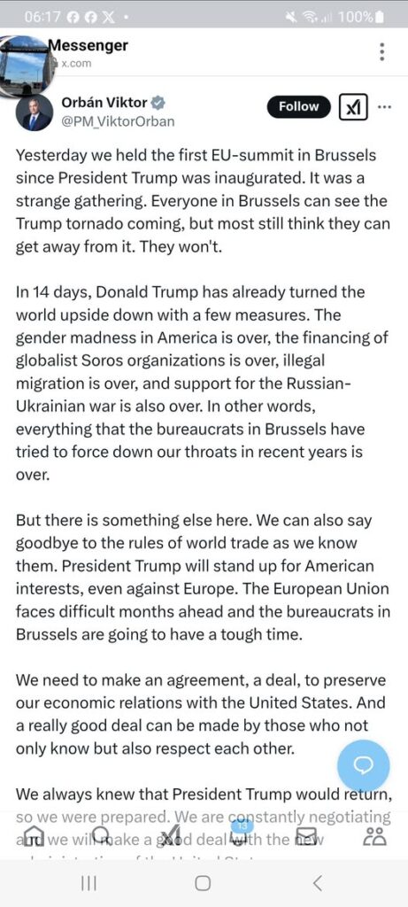 Yesterday we held the first EU-summit in Brussels since President Trump was inaugurated. It was a strange gathering. Everyone in Brussels can see the Trump tornado coming, but most still think they can get away from it. They won't. In 14 days, Donald Trump has already turned the world upside down with a few measures. The gender madness in America is over, the financing of globalist Soros organizations is over, illegal migration is over, and support for the Russian-Ukrainian war is also over. In other words, everything that the bureaucrats in Brussels have tried to force down our throats in recent years is over. But there is something else here. We can also say goodbye to the rules of world trade as we know them. President Trump will stand up for American interests, even against Europe. The European Union faces difficult months ahead and the bureaucrats in Brussels are going to have a tough time. We need to make an agreement, a deal, to preserve our economic relations with the United States. And a really good deal can be made by those who not only know but also respect each other. We always knew that President Trump would return, so we were prepared. We are constantly negotiating and we will make a good deal with the new administration of the United States. And what about the bureaucrats in Brussels? You’ve made your bed, now lie in it!