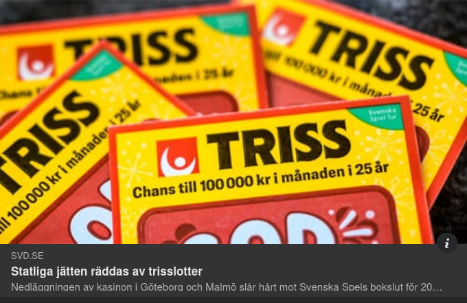 https://www.svd.se/a/VzXMd1/statliga-svenska-spel-raddas-av-trisslotter "Nedläggningen av kasinon i Göteborg och Malmö slår hårt mot Svenska Spels bokslut för 2024. Ljuspunkten är ”Turaffären” där Triss och Eurojackpot är jackpot även för den statliga speljätten. Hanna Lindberg Publicerad 2025-02-07 Följ skribent Sluta följa – Jag är otroligt stolt och glad över avslutningen, där framför allt Tur gör en rekordtillväxt. Det säger Anna Johnson, vd och koncernchef på Svenska Spel. ”Tur” är det största av den statliga speljättens fyra affärsområden, där bland andra Trisslotter ingår. Intäkterna för ”Tur” ökade med 7 procent under kvartalet, eller motsvarande 92 miljoner kronor. Det var den största ökningen hittills. Även Sport & Casino har fått fler kunder. – Det har varit en viktig satsning där fokus har legat på att vi växer hållbart. Turaffären är en sådan affär, det har varit fokus på den under en länge tid. Stängt stora kasinon Tillväxten, eller snarare frånvaron av den, har varit ett bekymmer för Svenska Spel under flera år. Såväl under helåret som sista kvartalen 2024 var intäkterna lägre än motsvarande period året dessförinnan. Enligt Anna Johnson finns tydliga förklaringar till årets tapp. – I vår kasinoverksamhet har vi stängt två stora kasinon under året, en i Göteborg och en i Malmö. Vi har också minskat öppettiderna i Stockholm och det påverkar våra intäkter mycket. Det är ett affärsområde som drivs med förlust och det är tufft, säger vd:n Anna Johnson. Anna Johnson, vd och koncernchef på Svenska Spel. Anna Johnson, vd och koncernchef på Svenska Spel. Foto: Svenska Spel De olicensierade spelbolagen har under de senaste åren ökat sin närvaro på marknaden. Men vd Anna Johnson, ser inte att Svenska Spels kunder har blivit färre på grund av det. – Men det är självklart att det påverkar möjligheterna och omsättningen för alla licensierade bolag, då det finns de som inte spelar med samma spelregler på marknaden. Det är oerhört problematiskt, säger hon och förklarar att risken att kunderna hamnar i spelproblem är högre när de tar sig in på marknaden. En ljuspunkt för fjärde kvartalet var dock lönsamheten. Trots fallande intäkter, kunde Svenska Spel-koncernen redovisa en något högre vinst under perioden. Nettovinsten för de tre månaderna blev 482 miljoner kronor, 100 miljoner mer än förra året. För helåret var dock vinsten lägre och Svenska Spels styrelse föreslår nu minskad utdelning till staten – 1,6 miljarder jämfört med 1,9 miljarder i fjol. Satsa på huvudprodukterna För att öka intäkterna under 2025 ska Svenska Spel satsa på att utveckla deras huvudprodukter och de affärer som de ser som lönsamma. Det gäller främst Turaffären men också Sport & Casino. – Vi kommer fortsätta att ha ett stort fokus på de produkter där vi ser att vi skapar spelglädje och drömmar för våra kunder. Och störst glädje, både för kunderna och bolaget, verkar Triss ge. Enligt vd:n Anna Johnson säljs i dag runt tre trisslotter i sekunden. – Det är den mest sålda produkten i dagligvaruhandeln, det skapar verkligen spelglädje för svenska folket. Svenska Spel i siffror 2024 2023 belopp i miljoner kronor Nettospelintäkt 7 737 8 029 Nettoomsättning* 5 444 5 789 Årets resultat 1 769 1 942 Nettospelintäkt per affärsområde Sport & Casino 2 073 2 165 Tur 5 135 4 923 Casino Cosmopol 165 473 Vegas 364 469 * efter bla spelskatt och direkta kostnader "
