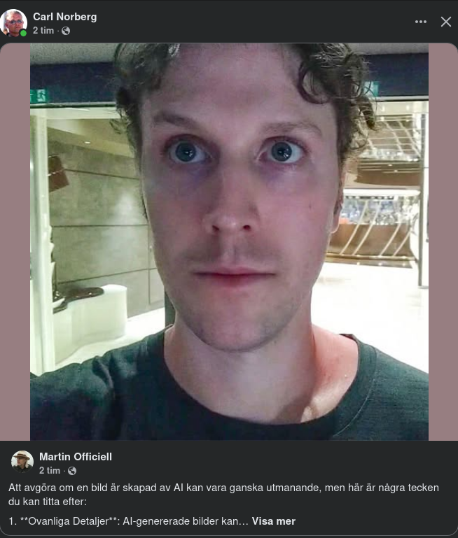 Att avgöra om en bild är skapad av AI kan vara ganska utmanande, men här är några tecken du kan titta efter: 1. **Ovanliga Detaljer**: AI-genererade bilder kan ibland ha konstiga eller ovanliga detaljer som inte riktigt stämmer med verkligheten, som extra fingrar, konstiga skuggor eller orealistiska texturer. 2. **Brist på Brus**: Bilder tagna med en kamera har ofta en viss mängd brus, särskilt i mörka områden. AI-genererade bilder kan vara för perfekta och sakna detta brus. 3. **För Perfekta Bakgrunder**: Om bakgrunden ser för perfekt ut, utan de små imperfektioner som finns i riktiga miljöer, kan det vara ett tecken. 4. **Konsistens**: Kontrollera om belysningen och skuggorna är konsekventa. AI kan ibland misslyckas med att få detta rätt. 5. **Förhöjda Detaljer**: Ibland kan AI överdriva detaljer som ögon, hår eller andra ansiktsdrag för att göra dem mer "perfekta". I den här bilden kan du titta på dessa aspekter. Till exempel, ser bakgrunden naturlig ut? Finns det några konstiga detaljer i håret eller kläderna? Om du fortfarande är osäker, kan det vara bra att jämföra med andra bilder av samma person eller plats för att se om det finns några uppenbara skillnader. Om du vill, kan jag också försöka generera en liknande bild för jämförelse.