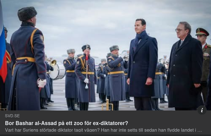 https://www.svd.se/a/5Eexme/bor-bashar-al-assad-pa-ett-zoo-for-ex-diktatorer "Vart har Syriens störtade diktator tagit vägen? Han har inte setts till sedan han flydde landet i december. Numera tros han bo på ett sorts zoo för rysk-allierade ex-diktatorer. I måndags dök det upp ett konto på sociala medier-plattformen X i Hafez al-Assads namn, det vill säga den 23-årige sonen till Syriens tidigare diktator. Där skrev han om hur han och hans pappa inte haft en tanke på att lämna vare sig Syrien eller Damaskus i december, när rebellerna närmade sig huvudstaden. Men efter några timmar stängdes kontot ned med motiveringen att det brutit mot plattformens regler. De flesta antog nog att det var ett fejkkonto, men i onsdags dök ett klipp upp. Var det kanske ändå Hafez al-Assad som låg bakom? Det har gått två månader sedan Bashar al-Assad, tidigt på morgonen den 8 december, lurade alla sina medarbetare och anhängare och i hemlighet flydde från Syrien i ett ryskt flygplan. Det innebar slutet för familjen Assads över 50 år långa diktatur och det nästan 14 år långa inbördeskriget som blev följden av att folket krävde mer demokrati under den så kallade arabiska våren 2011. Trots att diktaturen lyckats överleva så länge blev slutstriden kort, när rebellgrupper i Idlib gick samman i ett gemensamt angrepp på regimen. Assads allierade, Iran och Ryssland, var upptagna av egna bekymmer och den shiamuslimska Hizbollah-milisen var försvagad efter kriget mot Israel. Assads son Hafez konto på X stängdes ned. Bashar al-Assad verkade emellertid inte alltför bekymrad. När rebellerna inledde sin offensiv mot Aleppo den 27 november befann han sig över 200 mil därifrån. I Moskva. Han var där för att hans äldste son, Hafez, två dagar senare skulle lägga fram sin doktorsavhandling i matematik om algebraisk talteori. Dessutom behandlades Bashar al-Assads fru Asma där för sin leukemi. Rebellerna avancerade snabbt och al-Assad begärde att få träffa president Vladimir Putin. Han fick vänta två dagar innan det ägde rum. Mötet med Putin ska ha varit kyligt och Assads stab ombads att hålla tyst om att det ägt rum. Enligt den syriska diktatorns kommunikationschef lovade Putin att underlätta för iranskt stöd till Syrien. Samma kväll intog rebellerna citadellet i Aleppo och lät det fria Syriens flagga vaja där. Påstod att han skulle hålla tv-tal Bashar al-Assad flög hem till Syrien, men någon iransk hjälp kom inte. I stället fortsatte rebellernas avancemang och de närmade sig huvudstaden. Den 7 december ska Assad ha hållit ett möte med ett 30-tal armé- och säkerhetstjänstemän. Han försäkrade dem om att rysk militär hjälp var på väg och uppmanade markstyrkorna att hålla ut, enligt en källa till Reuters. Själv klev han på ett plan som med avstängd transponder tog honom från Damaskus till den ryska Hmeimim-basen, vid kusten. Klockan fyra på morgonen, efter flera timmars väntan på militärbasen, fick Assad besked om att han och hans familj beviljats skydd i Ryssland av humanitära skäl. Sedan dess har han inte synts till. Enda livstecknet är ett pressmeddelande den 16 december där han sa att han aldrig hade planerat att lämna Syrien eller söka asyl i Ryssland. Ett påstående som rimmar illa med att han och hans klan ska ha köpt fastigheter i Moskva för över 300 miljoner kronor. Bland annat så ska familjen enligt Natalia Telegina, på ryska antikorruptionsorganisationen Dossier center, äga lyxlägenheter med en yta på totalt 5 000 kvadratmeter i två skyskrapekomplex – City of Capitals och Capital Towers. – Det verkar som att Ryssland är det säkraste landet att gömma pengar i för alla möjliga tjuvar, mördare och andra, eftersom Ryssland förmodligen aldrig kommer att gripa någon för att den stulit pengar, säger hon till ryska The Insider. Under Assadklanens halvsekel vid makten tros enorma belopp ha förts ut ur Syrien. Amerikanska utrikesdepartementet uppskattade 2022 att familjens tillgångar utanför Syrien var värda tiotals, kanske hundratals, miljarder kronor. Utöver de ryska fastigheterna ska det även finnas boutiquehotell i Wien och ett privatjetplan i Dubai, enligt Wall Street Journal. Rysslands president Vladimir Putin ger Syriens störtade diktator Bashar al-Assad och hans familj skydd. Mellan 2018 och 2019 flögs över två ton sedlar i euro och dollar, värda flera miljarder, från Syrien till Moskva. Pengarna uppgavs vara betalning för ryskt vete och rysk försvarsmateriel, men kan också ha använts för att finansiera köpen av fastigheter. Familjen Assad tros dock inte bo i någon av lyxlägenheterna inne i Moskva. Det beskrivs som alltför osäkert och enligt Natalia Telegina hyrs fastigheterna i stället ut. Mer sannolikt är att Assadfamiljen bor i det så kallade Rublyovka-området, som breder ut sig väster om Moskva, längs motorvägen Rublyovo-Uspenskoye. Ett ”zoo för avsatta diktatorer” Det var redan under tsarryska tiden ett hem för förmögna och mäktiga personer. Efter revolutionen hade Vladimir Lenin och Josef Stalin sina sommarbostäder där. Numera har president Vladimir Putin och ryska säkerhetsrådets ordförande, Sergei Shojgu, palats där. I Rublyovka finns byn Barvicha, som av den brittiska Rysslandskännaren Mark Galeotti beskrivs som ett sorts zoo för Putins samling av avsatta diktatorer. Där finns Askar Akayev från Kirgizistan, som störtades 2005; Aslan Abashidze från Georgiens adzjariska autonoma republik, som dömts för terrorism och mord; Ukrainas tidigare president Viktor Janukovytj, som flydde efter Euromajdan 2014, och även krigsbrottsåtalade Slobodan Milosevics familj, från Serbien. Där tros också Bashar al-Assad och hans familj bo, i en överdådig herrgård bakom höga murar och utsmyckade metallportar. I byn finns det gott om exklusiva restauranger och butiker, dyra lyxbilar och säkerhetsvakter. Men frågan är hur långvarig vistelsen dä
