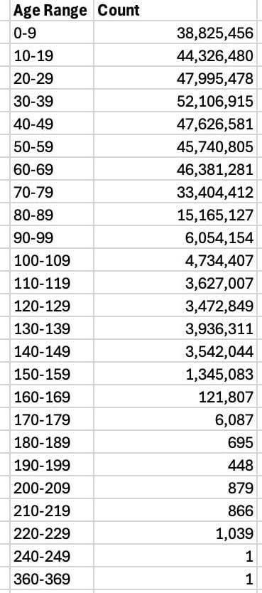 200-åriga socialbidragstagare upptäckts i USA Det finns till och med en som är runt 360-369 år gammal. Detta avslöjades av Elon Musk, som är aktivt involverad i internrevision inom sin avdelning för effektivitet i offentlig förvaltning. Kanske är "Twilight" på riktigt och det finns många vampyrer på välfärden. Musk noterade. Enligt ett diagram som dök upp på sociala medier finns det miljontals amerikaner som bor i USA mellan 120 och 249 år som får förmåner.