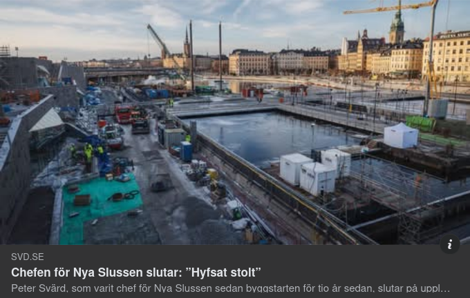 https://www.svd.se/a/PpLz5e/chefen-for-nya-slussen-slutar-pa-upploppet Peter Svärd, som varit chef för Nya Slussen sedan byggstarten för tio år sedan, slutar på upploppet av projektet. Han säger till SvD att det inte ligger någon dramatik bakom beslutet: ”Ingen är oumbärlig.” Sedan 2015 har Peter Svärd vid Stockholms stads exploateringskontor varit projektchef för Nya Slussen. Han har genom åren sett projektet kontinuerligt försvåras, försenas och fördyras. Även den biträdande chefen Lisa Jacobson lämnar projektet, som tidningen Byggindustrin var först att berätta om. Bygget av den 300 meter långa bussterminalen i Katarinaberget, med sex ankomstplatser, 17 avgångsplatser och uppställningsplats för 20 bussar, har utgjort den största hämskon och fått pendlare från Nacka och Värmdö att härdas. Sedan i somras finns en tillfällig bussterminal på Stadsgården, som innebär en cirka 800 meters promenad till Slussens tunnelbana. I en lägesrapport för två år sedan förklarades förseningarna bland annat med ”ökad kravställning kopplat till anläggningens funktion och kvalitet”, ”underskattande av projektets komplexitet” samt ”logistiska utmaningar”. I slutet av december rapporterade SvD att kostnaderna för projektet bedömdes öka med 657 miljoner kronor, från 5 807 miljoner kronor till 6 464 miljoner kronor. Det är fem gånger mer än den ursprungliga beräkningen. Anton Fendert (MP) slutade I januari kom också beskedet att ansvarige trafikregionrådet Anton Fendert (MP) lämnar sin post. Den 9 mars ska en ersättare väljas för kollektivtrafiken på Miljöpartiets Stockholmsdistrikts årsstämma. Peter Svärd tonar ner sin egen sorti: – Jag är hyfsat stolt över vad vi åstadkommit. Tio år är en lång tid. Jag har försökt tänka på när det skulle vara ett bra läge att sluta. Ingen är oumbärlig, säger han. Tillsammans med biträdande chef Lisa Jacobson ska Peter Svärd starta ett konsultföretag i branschen. Han slutar officiellt den 31 augusti. Slussens projektchef Peter Svärd. Arkivbild. Slussens projektchef Peter Svärd. Arkivbild. Foto: Magnus Hjalmarson Neideman Eva Rosman, kommunikationsansvarig för Nya Slussen, berättar att en annons om ny projektchef gått ut i dagarna. – Vi tycker det är jättetråkigt att de två slutar, men vi har förståelse för att man vill gå vidare. Det är en bra tidpunkt, vägen framåt är ritad och det finns en robust tidplan för att köra det här i mål, säger hon. I månadsskiftet augusti/september räknar man med att kunna lämna över bussterminalen med alla färdigställda installationer till Trafikförvaltningen. De har i sin tur sagt att man behöver fem och en halv månad på sig att trimma anläggningen innan alla SL-resenärer kan dra nytta av den. Det skulle innebära att den första bussen rullar ut från Katarinaberget om ungefär ett år. Den sista stora entreprenaden i projektet startade i september 2024. Den handlar om en överdäckning av Stadsgårdsledens östra del, som blir en del av Slusstunneln. Ovanpå byggs Katarinaparken och så småningom även Nobel center och kontorshus. – Den totala trafiklösningen med alla broar och omläggningar av trafiken beräknas vara klar först 2028/29, säger Eva Rosman.
