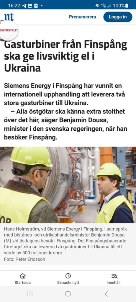 Under tisdagen gjorde bistånds- och utrikeshandelsminister Benjamin Dousa (M) en rundvandring i Siemens Energys lokaler i Finspång. – Det är imponerande vilket arbete som görs här. Jag har fått se delar av produktionen, forskningen och de två gasturbinerna som är aktuella just nu, säger Benjamin Dousa, när vi ses i ena slottsflygeln för en snabb presskonferens. Siemens Energy har i konkurrens med flera andra företag i världen, vunnit en upphandling som är värd 500 miljoner kronor. Det handlar om två stora gasturbiner, med kringutrustning, som ska levereras till Ukraina i närtid. Ryssland attackerar regelbundet infrastrukturen som försörjer Ukraina med el, vatten och värme – Sekretessen och säkerheten kring leveransen och var gasturbinerna ska placeras i Ukraina är omfattande. Det är dumt att peka ut på en karta var de ska placeras, förklarar Benjamin Dousa. De två Finspångstillverkade turbinerna beräknas ge el till cirka 370 000 människor. – Det här projektet är ett av Sveriges största bidrag till ukrainsk energiförsörjning. Eftersom turbinerna tillverkas här i Finspång och betalas med skattemedel tycker jag att alla östgötar ska känna extra stolthet över det här de kommande månaderna, säger Benjamin Dousa. Nyligen tog regeringen ett beslut att öka biståndet till Ukraina från 5,6 miljarder kronor per år till 6,7 miljarder kronor per år. Ukraina är det land som får mest biståndspengar av Sverige. – Så är det. Det finns också länder, Mali och Burkina Faso, där vi helt fasat ut det bilaterala biståndet, eftersom de länderna stöttar Ryssland, säger Benjamin Dousa. USA:s president Donald Trump har aviserat att USA ska upphöra eller åtminstone drastiskt minska det ekonomiska biståndet till Ukraina. Han vill att de europeiska länderna ska ta ett större ansvar. – Vi har framförallt två områden som vi kommer att följa noga och delvis hjälpa till att fylla ekonomiska "hål". Det gäller biståndet till Ukraina och flickors- och kvinnors rättigheter. Men Sverige kan inte göra allt, det är många länder i Europa som behöver öka sitt bistånd till Ukraina, berättar Benjamin Dousa. Målsättningen är att de två gasturbinerna från Siemens Energy i Finspång ska tas i drift i Ukraina under 2025. Vi har på olika sätt sökt Hans Holmström och Madeleine Davidsson, vd respektive kommunikationschef på Siemens Energy i Finspång, för en kommentar om affären med Ukraina. De har inte återkopplat.
