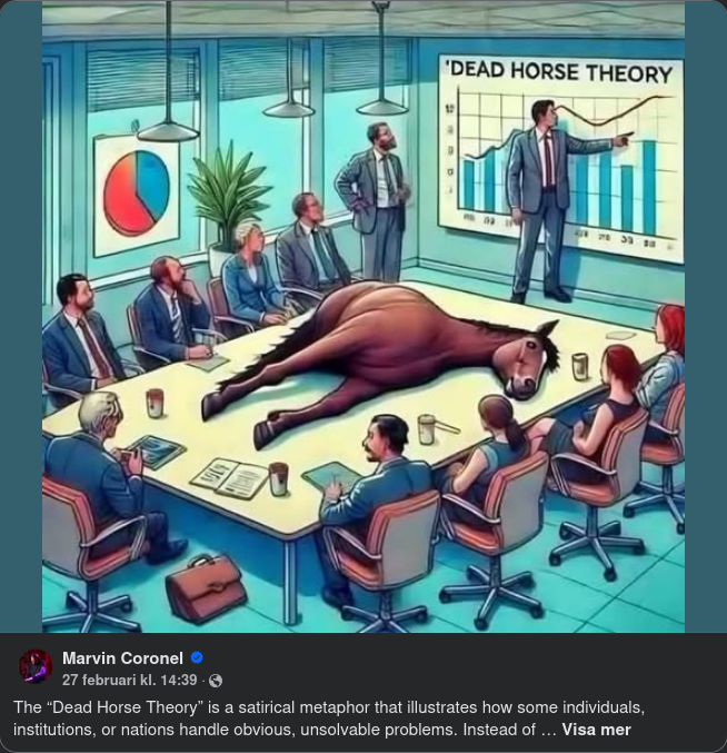 The “Dead Horse Theory” is a satirical metaphor that illustrates how some individuals, institutions, or nations handle obvious, unsolvable problems. Instead of accepting reality, they cling to justifying their actions. The core idea is simple: if you realize you’re riding a dead horse, the most sensible thing to do is dismount and move on. However, in practice, the opposite often happens. Instead of abandoning the dead horse, people take actions such as: • Buying a new saddle for the horse. • Improving the horse’s diet, despite it being dead. • Changing the rider instead of addressing the real problem. • Firing the horse caretaker and hiring someone new, hoping for a different outcome. • Holding meetings to discuss ways to increase the dead horse’s speed. • Creating committees or task forces to analyze the dead horse problem from every angle. These groups work for months, compile reports, and ultimately conclude the obvious: the horse is dead. • Justifying efforts by comparing the horse to other similarly dead horses, concluding that the issue was a lack of training. • Proposing training programs for the horse, which means increasing the budget. • Redefining the concept of “dead” to convince themselves the horse still has potential. The Lesson: This theory highlights how many people and organizations prefer to deny reality, wasting time, resources, and effort on ineffective solutions instead of acknowledging the problem from the start and making smarter, more effective decisions. What are your thoughts about this theory?