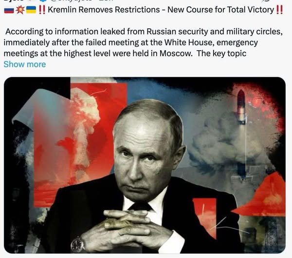 Too good to be true. Kremlin lifts restrictions — new course for total victory According to information leaked from Russian security and military circles, immediately after the failed meeting at the White House, emergency meetings at the highest level were held in Moscow. The key topic was deciding on the further course of the special military operation. According to inside information, President Vladimir Putin gave a direct order to Defense Minister Andrei Belousov to lift all previous operational restrictions and begin a new stage of military action — with the clear goal of completely defeating Ukrainian forces. This includes several key steps: Destruction of Ukraine's military and transport infrastructure. Disconnection of the energy system — Ukraine may be left without electricity for an indefinite period. Elimination of key Ukrainian leaders — attacks on high-ranking officials of the Kiev regime are expected to begin soon, including military commanders, ministers and advisers close to Zelensky. An offensive in several directions — Kharkov, Nikolaev and Odessa in focus. Militarily, Russian forces now have the ability to launch a strong offensive in several key directions. Nikolaev and Odessa - Russia is considering the possibility of conquering the southern part of Ukraine, which would completely cut off Kiev's access to the sea. One thing is certain - the Russian special military operation is entering a new phase in which there is no longer room for restrictions. The pressure on Ukraine will increase, and the possibility of a complete defeat of the Kiev regime now seems more real than ever.