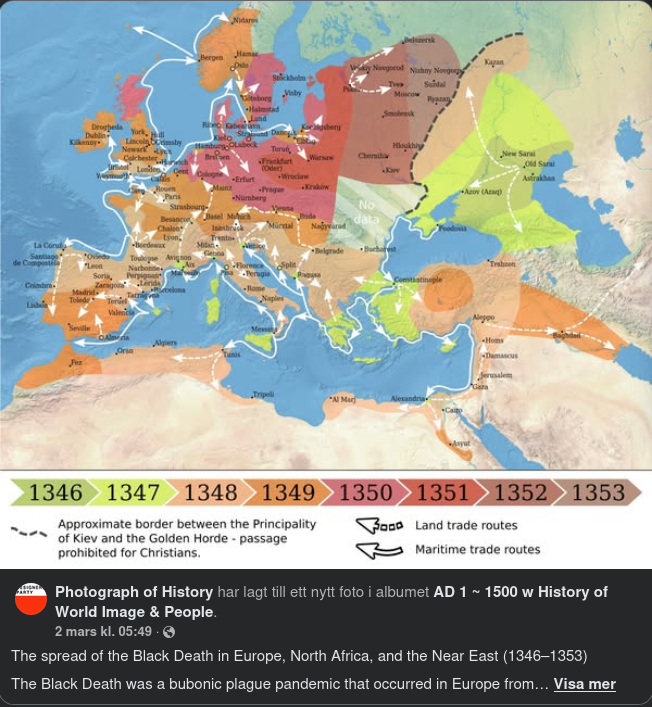 The spread of the Black Death in Europe, North Africa, and the Near East (1346–1353) The Black Death was a bubonic plague pandemic that occurred in Europe from 1346 to 1353. It was one of the most fatal pandemics in human history; as many as 50 million people perished, perhaps 50% of Europe's 14th century population. The disease is caused by the bacterium Yersinia pestis and spread by fleas and through the air. One of the most significant events in European history, the Black Death had far-reaching population, economic, and cultural impacts. It was the beginning of the second plague pandemic.[6] The plague created religious, social and economic upheavals, with profound effects on the course of European history. The origin of the Black Death is disputed. Genetic analysis suggests Yersinia pestis bacteria evolved approximately 7,000 years ago, at the beginning of the Neolithic, with flea-mediated strains emerging around 3,800 years ago during the late Bronze Age. The immediate territorial origins of the Black Death and its outbreak remain unclear, with some evidence pointing towards Central Asia, China, the Middle East, and Europe. The pandemic was reportedly first introduced to Europe during the siege of the Genoese trading port of Kaffa in Crimea by the Golden Horde army of Jani Beg in 1347. From Crimea, it was most likely carried by fleas living on the black rats that travelled on Genoese ships, spreading through the Mediterranean Basin and reaching North Africa, West Asia, and the rest of Europe via Constantinople, Sicily, and the Italian Peninsula. There is evidence that once it came ashore, the Black Death mainly spread from person-to-person as pneumonic plague, thus explaining the quick inland spread of the epidemic, which was faster than would be expected if the primary vector was rat fleas causing bubonic plague. In 2022, it was discovered that there was a sudden surge of deaths in what is today Kyrgyzstan from the Black Death in the late 1330s; when combined with genetic evidence, this implies that the initial spread may have been unrelated to the 14th century Mongol conquests previously postulated as the cause. The Black Death was the second great natural disaster to strike Europe during the Late Middle Ages (the first one being the Great Famine of 1315–1317) and is estimated to have killed 30% to 60% of the European population, as well as approximately 33% of the population of the Middle East. There were further outbreaks throughout the Late Middle Ages and, also due to other contributing factors (the Crisis of the Late Middle Ages), the European population did not regain its 14th century level until the 16th century. Outbreaks of the plague recurred around the world until the early 19th century. https://en.wikipedia.org/wiki/Black_Death * https://www.instagram.com/designersparty/