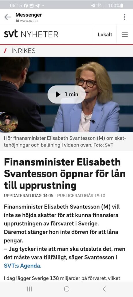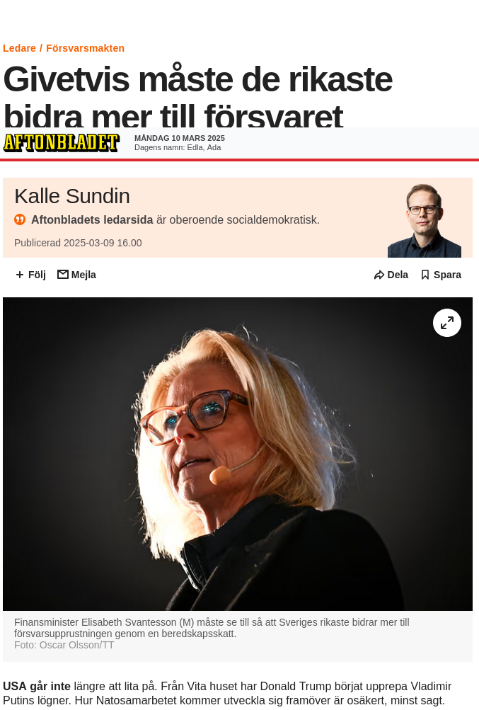 Finansminister Elisabeth Svantesson öppnar för lån till upprustning Uppdaterad idag 04:05Publicerad igår 19:10 Finansminister Elisabeth Svantesson (M) vill inte se höjda skatter för att kunna finansiera upprustningen av försvaret i Sverige. Däremot stänger hon inte dörren för att låna pengar. – Jag tycker inte att man ska utesluta det, men det måste vara tillfälligt, säger Svantesson i SVT:s Agenda. I dag lägger Sverige 138 miljarder på förvaret, vilket motsvarar 2,4 procent av BNP. Med anledning av det försämrade säkerhetsläget förs nu diskussioner om ökningar av anslaget. Inom Nato talas det om att målet bör höjas till 3,5 procent av BNP, vilket skulle innebära ytterligare 65 miljarder kronor ur Sveriges statskassa. Finansminister Elisabeth Svantesson (M) menar att Sverige har goda förutsättningar på grund av sina starka statsfinanser. – Både jag och finansministrar innan mig har tyckt det varit viktigt med ordning och reda, därför att i svåra tider kan vi använda den styrkan. Vi är mycket mer förberedda än andra länder. Utesluter inte lån I SVT:s Agenda säger Elisabeth Svantesson att hon inte utesluter lån för att snabbt kunna stärka försvaret. – Ett av många alternativ att diskutera är om vi under några år ska låna för att snabbt komma upp i ny nivå, säger hon och fortsätter: – Jag tycker inte att man ska utesluta det. Men det måste vara tillfälligt, annars har vi en skulduppbyggnad på sikt som vi inte klarar. Att finansiera upprustningen med höjda skatter är däremot inget Svantesson förespråkar. Hon trycker i stället på ökad tillväxt, att få ner arbetslösheten samt omprioriteringar i statens utgifter. – Att höja skatter sitter inte på min favoritlista, för risken finns då att man minskar trycket mot tillväxt och konkurrenskraft, säger hon. Finanspolitiska rådet för skattehöjningar Finanspolitiska rådets ordförande Lars Heikensten är kritisk till att pressa resurserna till välfärden ytterligare. Han föreslår i stället både skattehöjningar och utgiftsminskningar för att klara av de framtida kostnaderna för försvaret. Ett exempel han tar upp är en fastighetsskatt. – Jag är inte särskilt förtjust i skattehöjningar, men jag kan konstatera att de samhällsekonomiska kostnaderna av en fastighetsskatt inte är särskilt höga, om man jämför med skatter på arbete eller kapital, säger Lars Heikensten. Han ställer sig också skeptisk till att låna pengar till försvaret. – Man kan väl låna lite på marginalen, men då är det viktigt att vi kommer överens om det. Det blir billigare för oss som lever nu – men är det rättvist? Kommande generationer kommer få betala, säger han.https://www.aftonbladet.se/ledare/a/63vJ78/forsvaret-givetvis-maste-de-rikaste-bidra-mer-till-forsvaret