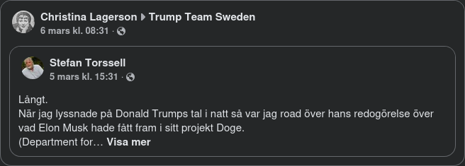 Långt. När jag lyssnade på Donald Trumps tal i natt så var jag road över hans redogörelse över vad Elon Musk hade fått fram i sitt projekt Doge. (Department for Goverment efficiency) alltså Myndigheten för effektiv statsförvaltning Jag har arbetat i svensk statsförvaltning, som är ett slukhål för skattebetalarnas pengar. De kontroller som ska göras sker av krumryggade, böjliga personer utan civilkurage De är korrumperade långt in till den plats där själen bör sitta. Jag har följt mörkläggningen av Estonia där 852 människor dog som aldrig fick en grav. I min bok var personförteckningen på 11 sidor. Många av dem är raka motsatsen till vad som just nu sker i Trumpadministrationen i USA. Tänk om en moralisk resning också hade funnits i Sverige. De siffror som Donald Trump räknade upp i natt uppfattade jag som ett skämt om olika administrativa fadäser inom amerikansk statsförvaltning. Jag har sett liknande i Sverige som man kan skratta åt. Kommunen som köper in en fastighet. Fastigheten överförs till tekniska nämnden. Fastigheten rustas upp. Därefter lämnas den över till Fastighetskontoret som beslutar om rivning. Sådant finns det gott om. Stockholm skulle bygga ett jättesjukhus. Man behövde mark och exproprierade ett koloniområde. Hundratals koloniägare blev av med sina odlingslotter. Man gjorde om stadsplanen, Jämnade marken, Började förstärka markområdet, men upptäckte att, marken var olämplig och bygget blev för dyrt och måste avbrytas. Vad skulle man göra? Man gjorde om stadsplanen igen och beslutade att området skulle bli ett koloniområde. Det är några av mina favorithistorier. Ibland avslöjas de båda Moderatledarnas Anna Kinberg Batras och Ulf Kristerssons anställningar av kompisar. Jag har själv skildrat hur Socialdemokraterna har hjälpt fram 25 muslimska organisationer som får 600 miljoner kronor per år. Dessa organisationer kontrolleras i huvudsak av ett 15-tal personer med rötter i en annan kultur. Tidningarna borde skriva om dessa svindlerier, men de är numera en del av kriminaliteten. Road lyssnade jag på Donald Trumps redogörelse Att 4,7 miljoner människor mellan 100 och 109 år fanns registrerade i Social Security Administration (SSA). Det är ett system för socialförsäkringar där man får ett ID-nummer som man sedan kan använda för bidrag och försäkringar. 3,6 miljoner var mellan 110 och 119 år. Under åhörarnas skratt fortsatte han uppräkningen. 300 000 är över 160 år. till slut var det bara en kvar som var över 360 år. Elon Musk har tillsammans med de bästa datakillarna kunnat plocka fram dessa siffror. I Sverige finns det människor som har flera identiteter som plockar pengar ur systemen. I Sverige verkar ingen vilja eller kunna göra något åt dessa bedrägerier. Hur många betalar ut åt sig själva eller sina familjer? Det blev för magstarkt även för våra journalister när det avslöjades att Iraks försvarsminister och hans fru hade socialbidrag i Sverige, samtidigt som de bodde i Irak. För många år sedan fanns en ”svensk” som hade 28 olika nationaliteter. Han bodde i Hamburg. En gång i månaden åkte han upp till 28 olika kommuner i södra Sverige där han kunde plocka ut 28 socialbidrag. Han var mantalsskriven i alla 28 kommunerna. Sådana bedrägerier har tillåtits år efter år. Tidöregeringen lovade en folkräkning. Den har ännu inte kommit igång. Slapphet och bristande rättskänsla har gjort att denna vanskötsel har kunnat fortgå. Om någon socialsekreterare har ifrågasatt de sökandes uppgifter, så har bedragarna anklagat dem för rasism. De har sedan i chefens närvaro tvingats att be bedragaren om ursäkt. Alla vet att om en elev anklagade en lärare för rasism så fick läraren sparken. När det gäller assistansbidrag så har miljarder betalats ut felaktigt. Ingen av handläggarna har vågat ifrågasätta för att inte bli kallad för rasist. Jag har arbetat i ansvarsbefattning i kommunal och statlig tjänst. Jag vet hur systemen fungerar. När jag sedan år 2012 har krävt ändringar i vårt system så har även jag kallats för rasist, fascist och nazist och även högerextrem. Jag betraktar mig själv som borgerlig vänster med en arbetarklass- och ämbetsmannamoral. Borgerlig därför att jag tror på marknadsekonomin samt äganderätten. Vänster därför att jag är för en solidarisk fördelningspolitik. Jag vill att de duktiga ska tillåtas kämpa och ha framgångsrika företag, men jag vill att de som inte orkar med eller är sköra ska tillåtas leva ett värdigt liv. Gunnar Hedlund är mitt politiska föredöme. Alltså hyfsat normala svenska värderingar. Rätt sak på rätt sätt i rätt ordning. Därför lyssnade jag roat på Donald Trumps redogörelse. Nu kom inte uppgifterna från några strykrädda tjänstemän som i inlindade fraser har upptäckt fusk någonstans, utan från världens rikaste och världens mäktigaste män. Donald Trump har dessutom själv den verkställande makten. Donald Trump och Elon Musk har ingen korrumperad socialdemokratisk minister över sig som stoppar alla fortsatta undersökningar. Men tror ni inte att Expressen som har hjälpt till att mörklägga Estonia (men inte lika mycket som Aftonbladet och Public service som är rent kriminella i sin rapportering) men tror ni inte att Expressen försöker försvara vanskötseln i SSA. I dagens tidning så skriver Johan Eriksson under rubriken ”Trumps bluff om Musks siffror” Denna typ av förvillare finns det gott om i Sverige. Journalisterna står som karyatider (grekiska skulpturer av kvinnor som håller upp olika kolonner) och ger stöd år alla osanningar i ett korrumperat system ovanför dem. Jag har träffat massor av dem. Ögon som flackar. Johan Eriksson skriver att Elon Musk inte har rätt. Han skriver att det är ett ofullständigt datasystem, där ofullständiga födelsedatum kan hamna på ett felaktigt standardvärde. Det är alltså Expresse