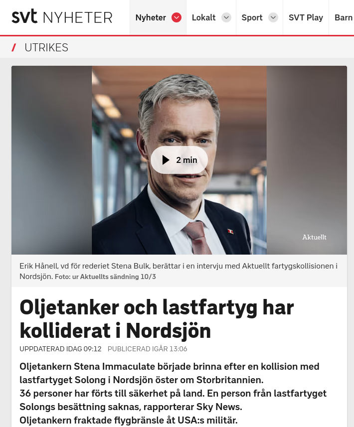 Uppdaterad idag 09:12 Publicerad igår 13:06 Oljetankern Stena Immaculate började brinna efter en kollision med lastfartyget Solong i Nordsjön öster om Storbritannien. 36 personer har förts till säkerhet på land. En person från lastfartyget Solongs besättning saknas, rapporterar Sky News. Oljetankern fraktade flygbränsle åt USA:s militär. Larmet om olyckan kom 10.48 på förmiddagen, svensk tid. Bilder från platsen visar hur rök och flammor slår upp från den 183 meter långa oljetankern. En stor räddningsoperation bestående av helikoptrar, flygplan och båtar med utrustning för att släcka bränder skickades till platsen. Stena Immaculate används för att frakta flygbränsle på uppdrag åt det det amerikanska försvarsdepartementet. USA har flera flygbaser i Storbritannien. Lastfartyget Solong, registrerat i Portugal, fraktade bland annat 15 containrar med det giftiga ämnet natriumcyanid. Det är inte känt om Solongs last hamnat i vattnet. Insatser har inletts för att försöka begränsa läckage av bränsle och kemikalier. Besättningen i säkerhet Totalt 36 personer från de två besättningarna har förts i land till den närmaste hamnen i Grimsby på den brittiska östkusten, rapporterar Sky News. En person från lastfartyget Solongs besättning saknas fortfarande. Erik Hånell, vd för Stena Bulk som deläger Stena Immaculate, säger till SVT Nyheter att besättningen är i säkerhet. – Som jag förstår det är alla oskadade. Men de är självklart chockade och glada att de har klarat livhanken, säger han. Dimma när fartygen kolliderade Det är inte känt vad som orsakade olyckan. Stena Immaculate hade färdats från Grekland till hamnen i Hull och låg vid tillfället för ankar, ungefär 1,5 mil från kusten. Solong färdades norrifrån på väg från Skottland till Nederländerna i en hastighet av 16 knop, vilket är normalfart. Martyn Boyers, hamnchef i Grimsby, säger till Sky News att det var relativt gynnsamt väder med omkring två meter höga vågor vid tillfället. – Det enda är att det var väldigt mycket dimma den här morgonen. Men alla fartyg nu har all nödvändig utrustning såsom radar för att navigera. Så det är en väldigt, väldigt ovanlig och tragisk olycka, säger han.