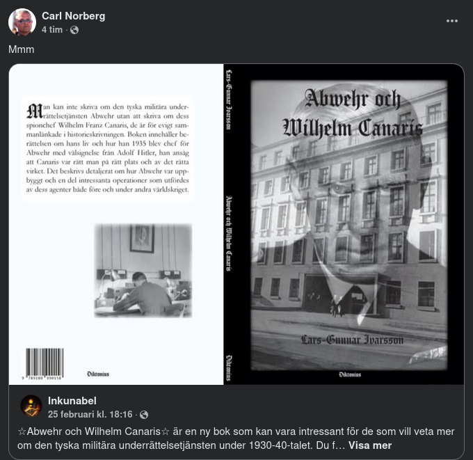 ☆Abwehr och Wilhelm Canaris☆ är en ny bok som kan vara intressant för de som vill veta mer om den tyska militära underrättelsetjänsten under 1930-40-talet. Du får en inblick i hur Abwehr var uppbyggt och läsa om en del operationer som utfördes. Man får en större bild om hur dess spionchef Wilhelm Canaris utvecklades från en marinofficer i den kejserliga marinen till chef för den militära underrättelsetjänsten. När det gäller historia, så även denna berättelse, så finns det alltid erfarenheter och kunskaper man kan använda som nycklar för att förstå nutida händelser. Bokens pris är 99 Kr på förlaget Diktonius Text (länk nedanför) och något dyrare på andra ställen, till exempel Adlibris, Bokus, Akademibokhandeln. https://webshop.publit.com/.../abwehr-och-wilhelm-canaris