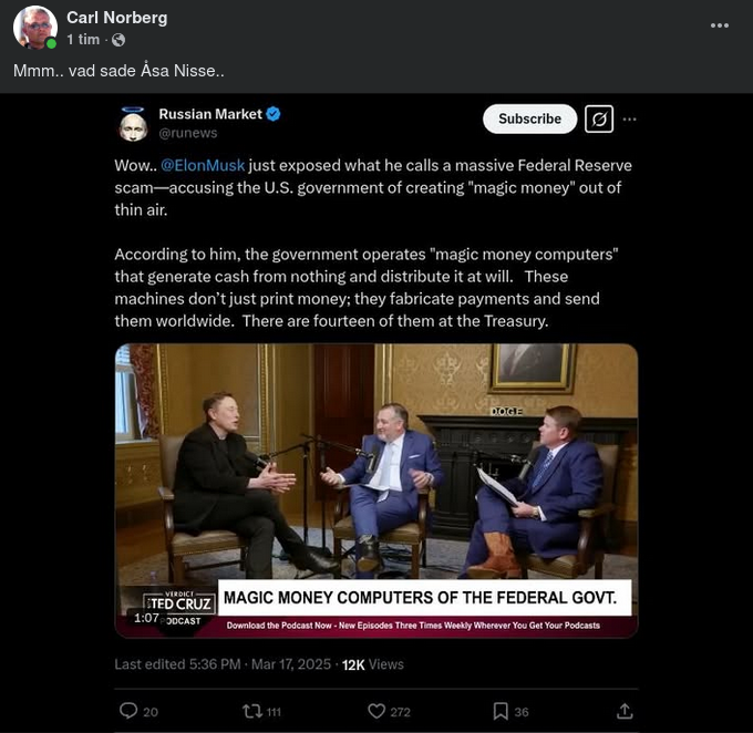 Höstluften vibrerar av visdomsord: "Vi får inte urholka förtroendet för våra offentliga finanser" (Magdalena Andersson) och "vi ska inte skuldsätta kommande generationer" (Elisabeth Svantesson). Sex av åtta riksdagspartier har klappat igenom ett finanspolitiskt ramverk, stramt som en bankirs samvete. Staten är ett hushåll, skuld är synd, och "den som är satt i skuld är inte fri" – metaforerna staplas som gräshoppor i en egyptisk skräckfilm. Men nu har Elon Musk snubblat över sanningen: magiska datorer som skapar pengar. Välkommen till trollkonsten vi kallar ekonomi. Staten: Den ursprungliga trollkarlen Glöm spargrisen – staten trollar fram sina kronor. Myndigheter övertrasserar sina bankkonton – noll blir minus, mottagarens konto får plus, och pengar föds ur tomma intet. Bankerna får en "skuld" som Riksbanken fixar genom att flytta siffror från statens centralkonto (också noll varje morgon) till bankernas transaktionskonton. Skatter? De finansierar inget – de raderas vid insättning. André Oscar Wallenberg hade spytt – hans dröm om folkets inlåning krossades av detta hokus pokus. Statsskulden: Ett nummertrick Underskott? Sälj statsobligationer, säger sagan. Men det är inget lån – lagen (svensk och EU) förbjuder ett negativt centralkonto över natten, så staten ombokar bankernas saldon från transaktionskonton till värdepapperskonton hos Riksbanken. När obligationen löper ut? Flytta tillbaka – ingen krona lånas, bara siffror som dansar. Offentliga betalningar skapar pengarna, och Musk har nu hittat maskinen: "Magiska datorer," säger han – fast vi kallar det Riksbanken sedan 1668. Musk avslöjar bluffen Elon, med sin näsa för kaos, har råkat peka på elefanten i rummet – datorer som spottar ut pengar är inte nytt, det är hela systemet! FED, Riksbanken, hela gänget har trollat så sedan guldstandarden dumpades 1971. Swaplinjer (2008–2009), fractional reserve – ett pyramidspel där offentliga betalningar göder skuld, inte samhälle. Thiel och hans Palantir var ett verktyg för att dränera träsket, men Musk avslöjar showen: det är ingen magi, bara ett trick vi betalar för. Varför svälter vi då? Politikerna köper fortfarande hushållsmyten – "pengarna tar slut," gnäller de, medan välfärden svälter, järnvägen rostar, och arbetslösheten är kronisk. Musk ser det, jag ser det, till och med Wallenberg (som sanerar Djupa Staten) ser det – men ramverket låtsas att staten inte är självfinansierande. Skatter är en kuliss, statsskulden en lögn, och vi lider för en saga som Oxenstiernas byråkrater hade älskat. Slutet på cirkusen År 2025 rasar fasaden – FED:s smutsiga linor och Riksbankens kulisser spricker. Musk skrattar hela vägen till banken (eller datorn), medan AI gör trollnumret transparent. Techmiljardärerna är passé; folket kan ta över. Offentliga betalningar skapade pengar, men eliten gjorde dem till bojor. Resan är målet – släng ramverket, sanera Mordor, och låt oss bygga något som inte luktar bluff. Luften är tjock av lögner och magiska datorer. Andas in, och skratta uthttps://x.com/runews/status/1901673886296543563