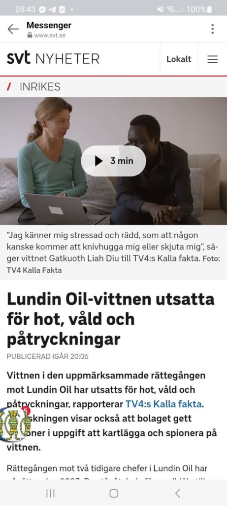 Vittnen i den uppmärksammade rättegången mot Lundin Oil har utsatts för hot, våld och påtryckningar, rapporterar TV4:s Kalla fakta. Granskningen visar också att bolaget gett personer i uppgift att kartlägga och spionera på vittnen. Rättegången mot två tidigare chefer i Lundin Oil har pågått sedan 2023. De står åtalade för medhjälp till grovt folkrättsbrott i dåvarande södra Sudan i samband med bolagets oljeprospektering i området. Kalla fakta har tagit del av en rapport där ett 40-tal personer, både vittnen och anhöriga, rapporterat att de utsatts för allt från hot och kidnappningar till mutförsök. Totalt handlar det om närmare 400 incidenter mellan 2014 och 2024, varav sex händelser uppges handla om misstänkta mord. Vittnet var barnsoldat – fruktar för sitt liv En av dem som blivit utsatt är den tidigare barnsoldaten Gatkuoth Liah Diu. Han bevittnade som nioåring hur familjemedlemmar dödades i en massaker i hans hemby. – Jag känner mig stressad och rädd, som att någon kanske kommer att knivhugga mig eller skjuta mig, säger han till Kalla fakta. Han är en av ett tiotal personer som enligt uppgifter till Kalla fakta lever under vittnesskydd i länder i Europa och Nordamerika för att hoten anses utgöra en fara för deras liv. Fick dödshot innan första framträdandet Ett annat vittne fick en ljudfil med ett dödshot från ett anonymt nummer i Sydsudan när han i höstas skulle framträda i Stockholms tingsrätt för första gången. ”Till de som åkt till Sverige för att vittna i Lundinfallet: Vi har alla era namn här. Vi kommer att döda er en efter en”, sa rösten. Kalla fakta har också tagit del av dokument som visar att Lundin Oil under namnet ”Project sunrise” gett konsulter i uppdrag att kartlägga och spionera på vittnen. Det finns enligt Kalla fakta inga bevis för att företrädare för Lundin uppmanat till att hota eller bruka våld mot vittnen. Däremot har personer i ledningen upprepade gånger informerats om att vittnen i vissa fall hotats till livet, enligt Kalla fakta. Förundersökning om övergrepp i rättssak Lundin Oil, som nu heter Orrön Energy, avvisar bestämt anklagelserna som framkommer i Kalla faktas granskning. ”Det är ofattbart att dessa grundlösa anklagelser fortsätter att användas för att misskreditera bolaget och dess företrädare”, står det i ett mejl till SVT. Bolaget hänvisar också till att de tidigare utreddes för övergrepp i rättssak och att fallet lades ner 2023. Förundersökningen återupptogs däremot i somras efter att nya hot framkommit, bekräftar åklagaren för SVT. Ingen har ännu delgivits misstanke om brott i den utredningen.