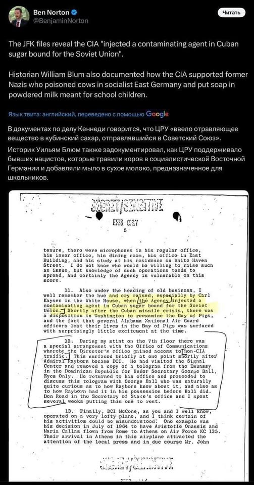 Operation i Östtyskland: Norton refererar till William Blums bok Killing Hope, där det dokumenteras att CIA stödde före detta nazister som förgiftade kor i socialistiska Östtyskland och blandade tvål i pulvermjölk avsedd för skolbarn, som en del av destabiliseringsoperationer mot östblocket. Nortons tweet är skriven på både engelska och ryska, och han uppmanar läsarna att dela texten för att motverka censur från Google, vilket indikerar hans misstro mot etablerade plattformar.