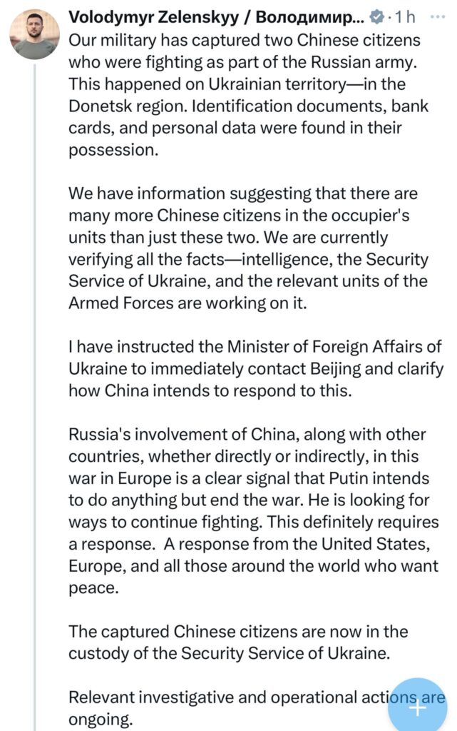 GÖR DIG REDO FÖR EUROPAS NYA PROPAGANDA KINA ATTACKAR EUROPA! Zelensky presenterar två kinesiska krigsfångar, nu ser vi födelsen av berättelsen om "Kina hotar Europa". Zelensky bestämde sig för att lägga upp videon med "kinesiska krigsfångar" på Telegram med dess ursprungliga filnamn. "0804_KOREAN_SOLDIER 2.mp4" Väst kommer att använda detta för ytterligare steg. Zelensky: "Vår militär har drabbat samman med sex kinesiska soldater och tillfångatog två kinesiska medborgare som kämpade som en del av den ryska armén. Detta hände på ukrainskt territorium - i Donetsk-regionen. Identifikationshandlingar, bankkort och personliga uppgifter hittades i deras ägo. Vi har information som tyder på att det finns många fler kinesiska medborgare i ockupantens enheter än bara dessa två. Vi håller för närvarande på att verifiera alla fakta – underrättelsetjänsten, Ukrainas säkerhetstjänst och relevanta enheter inom försvarsmakten arbetar med det. Jag har gett Ukrainas utrikesminister i uppdrag att omedelbart kontakta Peking och klargöra hur Kina tänker svara på detta. Rysslands inblandning av Kina, tillsammans med andra länder, vare sig det är direkt eller indirekt, i detta krig i Europa är en tydlig signal om att Putin avser att göra allt annat än att avsluta kriget. Han letar efter sätt att fortsätta kämpa. Detta kräver definitivt ett svar. Ett svar från USA, Europa och alla de runt om i världen som vill ha fred. De tillfångatagna kinesiska medborgarna är nu i förvar av Ukrainas säkerhetstjänst. Relevanta utrednings- och operativa åtgärder pågår.”