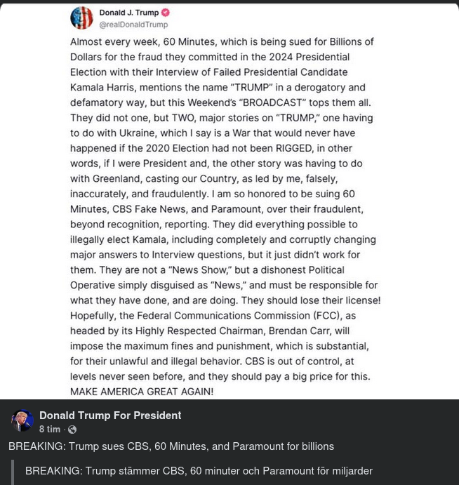 Trump Stämmer CBS, 60 Minutes & Paramount På 60 Miljarder Dollar