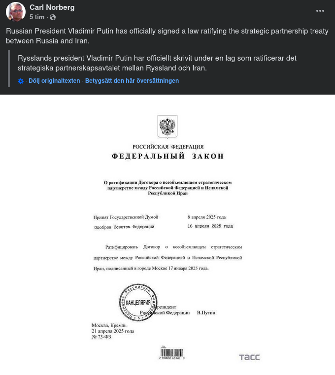 Avtal Mellan Ryssland & Iran Ratificerat Av Putin
