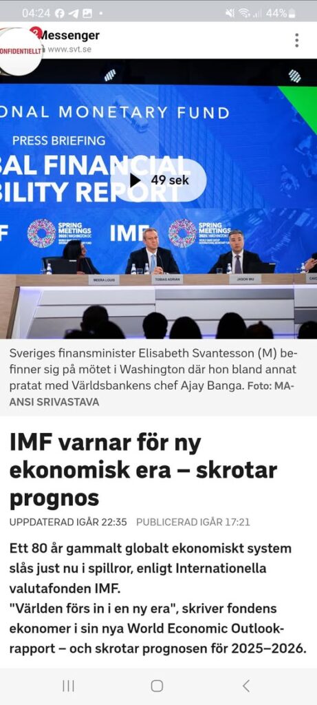 Det osäkra och komplexa läget efter Trumpregeringens tullchock gör att Internationella valutafonden (IMF) inte ger ut någon traditionell prognos i vårens upplaga av World Economic Outlook. "Befintliga regler utmanas och nya regler har ännu inte utformats", skriver IMF:s chefsekonom Pierre-Olivier Gourinchas i ett blogginlägg där han presenterar rapportens huvuddrag. Global tillväxt faller IMF-ekonomerna väljer i stället att redovisa en så kallad referensprognos, utifrån vilken man skissar på tänkbara scenarion. Referensprognosen beskriver en framtid där global tillväxt faller till 2,8 procent i år och 3,0 procent 2026. Det bygger på den information som fanns tillgänglig den 4 april i år. Det är ingen global recession. Men det kan jämföras med 3,3 procent i global tillväxt i fjol och IMF-ekonomernas januariprognos på 3,3 procent i global tillväxt för 2025–2026. Det historiska genomsnittet för global tillväxt ligger enligt IMF på 3,9 procent. Finansministern: Ödesmättad stämning Rapporten presenteras i samband med IMF:s vårmöte i Washington, USA, som äger rum i veckan. Sveriges finansminister Elisabeth Svantesson (M) befinner sig på mötet i Washington där hon bland annat träffat Världsbankens chef Ajay Banga. – Det är ödesmättad stämning. Mycket har förändrats på bara på några månader, säger hon. När hon besökte Washington i december före Trumps tillträde trodde många att de ekonomiska utspelen var förhandlingstaktik. Men allt har blivit värre än de förutspådde, konstaterar hon. – Runtom i världen får man nu räkna med att tillväxten backar. Det drabbar USA, Sverige men även de fattigare länderna som är så beroende av frihandel. Det här får grundvalarna att skaka en hel del. Fakta: Mycket sämre utsikter för USA och Kina IMF:s referensprognos för global tillväxt 2025 och 2026 ligger på 2,8 respektive 3,0 procent. Det kan jämföras med IMF-prognosen på 3,3 procent i global tillväxt för de båda åren så sent som i januari. IMF-ekonomerna räknar med en tillväxt för världshandeln på 1,7 respektive 2,5 procent under de båda åren, ned från 3,2 respektive 3,3 procent i januari. Och prognosen för global inflation höjs med 0,1 procentenheter för de båda åren till 4,3 respektive 3,6 procent. För världens största ekonomi, USA, pekar referensprognosen för 2025 och 2026 på en tillväxt på 1,8 respektive 1,7 procent. I januari låg IMF:s USA-prognos för de åren på 2,7 respektive 2,1 procent. För nummer två i världen, Kina, hamnar referensprognosen för de två åren på 4,0 procent, mot tidigare 4,6 respektive 4,5 procent. Eurozonen väntas enligt referensprognosen växa med 0,8 respektive 1,2 procent under 2025 respektive 2026. Där låg prognosen i januari på en tillväxt på 1,0 respektive 1,4 procent. Källa: IMF, World Economic Outlook, april 2025