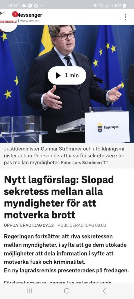 Regeringen fortsätter att riva sekretessen mellan myndigheter, i syfte att ge dem utökade möjligheter att dela information i syfte att motverka fusk och kriminalitet. En ny lagrådsremiss presenterades på fredagen. Förslaget om en ny, generell sekretessbrytande bestämmelse ämnar till att ytterligare öka myndigheters möjligheter att dela information om enskilda personer, bland annat om det behövs för att utreda brott. – Den innebär att alla myndigheter ska ges ökade möjligheter att dela information, för att upptäcka och sätta stopp för kriminalitet och andra ljusskygga verksamheter, säger justitieminister Gunnar Strömmer (M) på en pressträff, tillsammans med företrädare för de övriga Tidöpartierna. Intresseavvägning ska göras Andra lovliga syften är att förebygga, förhindra eller upptäcka brottslig verksamhet, felaktiga utbetalningar, fusk eller regelöverträdelser. – Bakgrunden är välkänd, det här motiveras verkligen inte bara av den organiserade brottsligheten, men det är klart en viktig del, säger Strömmer. – Sammantaget så innebär det här ett systemskifte när det kommer till sekretess, där vi går från utgångspunkten att inte dela information, säger Adam Marttinen (SD), ledamot i justitieutskottet. En intresseavvägning ska göras innan en uppgift lämnas ut. Vissa särskilt känsliga uppgifter undantas också, bland annat inom hälso- och sjukvården. – Det är klart att vi inte ska gå längre än vad som är nödvändigt. Personlig integritet är fortsatt viktigt, säger civilminister Erik Slottner (KD). Tidigare sekretessförändringar Regeringen har redan öppnat för mer informationsutbyte mellan myndigheter i flera steg. I fjol blev kommunerna, a-kassorna och vissa statliga myndigheter skyldiga att dela information för att motverka felaktiga utbetalningar från välfärdssystemen, och den 1 april blev bland andra kommuner, regioner och skolor skyldiga att lämna uppgifter till brottsbekämpande myndigheter – både på begäran och eget initiativ. Det nya förslaget innebär att samtliga myndigheter, kommuner och regioner får dela information. Till dessa räknas även a-kassorna och vissa andra så kallade privaträttsliga organ. Socialtjänstsekretessen undantas inte, vilket innebär att även uppgifter som omfattas av den kommer att kunna delas. – Information får lämnas både på eget initiativ men också på begäran från andra, säger utbildningsminister och Liberalernas partiledare Johan Pehrson. – Det här gör att tröskeln för informationsdelning sätts mycket lågt inom de här myndigheterna. Lagändringen föreslås träda i kraft den 1 december 2025.