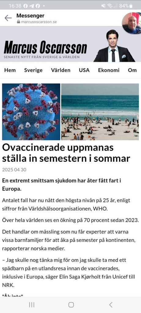 En extremt smittsam sjukdom har åter fått fart i Europa. Antalet fall har nu nått den högsta nivån på 25 år, enligt siffror från Världshälsoorganisationen, WHO. Över hela världen ses en ökning på 70 procent sedan 2023. Det handlar om mässling som nu får experter att varna vissa barnfamiljer för att åka på semester på kontinenten, rapporterar norska medier. – Jag skulle nog tänka mig för om jag skulle ta med ett spädbarn på en utlandsresa innan de vaccinerades, inklusive i Europa, säger Elin Saga Kjørholt från Unicef till NRK. "Åk inte" Mässling är en mycket smittsam sjukdom. En person smittar mellan 12 och 18 personer. Barn under fem år står dessutom för över 40 procent av de rapporterade fallen i 53 länder i Europa och Centralasien, enligt FN. En stor förklaring är att vaccinationsgraden minskar och flockimmuniteten därmed försvagas. – Det är det mest smittsamma vi har, både med luftburen och droppsmitta, säger Gunnar Hasle till Dagbladet. Han är överläkare på Kry reseklinik och specialist i infektionsmedicin. Experten varnar uttryckligen familjer att resa till länder med hög smittspridning om man reser med ett ovaccinerat barn. – Om du ska åka till ett av länderna med högst förekomst skulle jag överväga att inte åka. Exotiska resmål med små barn är helt onödiga, säger Hasle. – Om du absolut måste resa med en bebis, så påskynda vaccinationen. Tio gånger så många fall Mässling beskrivs av experter som den allvarligaste av alla barnsjukdomar, med symtom som hög feber, hosta och utslag på kroppen.. Förra året stod Europa för en tredjedel av alla fall av sjukdomen i hela världen. Nästan tio gånger så många fall konstaterades jämfört med året dessförinnan. Rumänien var värst med nästan 31 000 fall av mässling. Även i USA har mässling fått fart och förra veckan varnade forskare för att sjukdomen är på väg att komma tillbaka med regelbunden spridning på höga nivåer. I Sverige har i genomsnitt 16 fall rapporterats per år under den senaste tioårsperioden, enligt Folkhälsomyndigheten