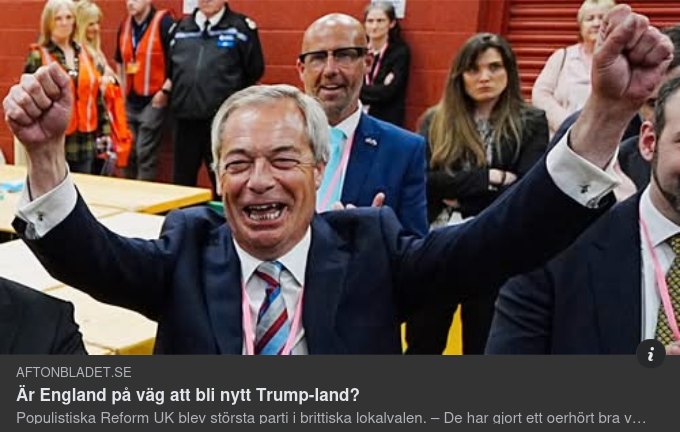 Partiledaren Nigel Farage firar Reform Uk:s framgångar i lokalvalen. Populistiska Reform UK blev största parti i brittiska lokalvalen. – De har gjort ett oerhört bra val, säger statsvetaren Jonas Hinnfors. Blir England ett nytt Trump-land om de vinner nästa parlamentsval? Snabbversion Reform UK vann 30 procent av rösterna i brittiska lokalvalen, och besegrade de etablerade partierna Labour och Tories. Det konservativa partiet upplevde sitt sämsta valresultat under 2000-talet och står inför hotet att förlora ytterligare stöd till Reform UK. Frågor som migration och anti-woke dominerar Reform UK:s agenda, vilket ökar konkurrensen och skapar en splittrad höger. När siffrorna från de brittiska lokalvalen offentliggjordes i går fredag var det framför allt en genomklappning för konservativa Tories, men också ett fiasko för regerande Labour. Populistiska Reform UK med jublande glada partiledaren Nigel Farage fick 30 procent av rösterna, Labour 20, Liberaldemokraterna 17, Tories bara 15 procent och Green Party 10, enligt tidningen The Guardian. Jonas Hinnfors, professor i statsvetenskap vid Göteborgs universitet, säger: – Man får komma ihåg att det var ett lokalval med lågt valdeltagande, i vissa valkretsar röstade bara 27-30 procent av väljarna. Det är också ett tillfälle där väljarna kan pröva något annat än de ordinarie partierna. Men med det i åtanke har Reform UK gjort ett oerhört bra val. Sämst på 25 år Han konstaterar att ”det konservativa partiet kollapsar” och har gjort sitt sämsta valresultat under 2000-talet. – Reform UK är ett hot både mot Labour och Tories, men framför allt mot Tories, säger Hinnfors. Jonas Hinnfors konstaterar att Labour än så länge sitter säkert på riksplanet. Kan Storbritannien snart bli ett nytt Trump-land? – Det är långt kvar till nästa parlamentsval som ska hållas senast 2029, så Labour sitter ju säkert med en jättestor majoritet till dess. Men retoriken i England är på väg att bli ”Trump-light”, i alla fall när det gäller typiska Trump-frågor som anti-woke, ineffektiv statsförvaltning, slöseri, migration. Men Reform UK:s partiledare är lite mer konsekvent än Trump, säger Hinnfors. Liknar Trumps valmöten Även om Nigel Farages valmöten har börjat likna Trumps – inte minst med Village Peoples låt Y.M.C.A. – så har den amerikanske presidentens effektiviseringschef Elon Musk kritiserat engelsmannen: – Farage har inte det som krävs, skrev Musk på X och ville ha honom utbytt. Många konservativa Tory-politiker håller inte med, till exempel förra ministern Andrea Jenkyns som gått över till Reform UK. Enligt Jonas Hinnfors är det konservativa partiets stora problem att de siktar in sig på samma frågor som Reform UK – invandringen, anti-wokebudskap, brexit. – Man sätter fokus på de här frågorna, och då är Reform UK tydligast, konstaterar Hinnfors. Han menar också att det finns en ”kvardröjande proteströst” mot de konservativa, som i regeringsställning utlovade halverad invandring. I stället blev den högst någonsin under Rishi Sunaks ledning. ”Kvardröjande proteströster” mot de konservativa kan förklara Reform UK:s framgångar. Under Rishi Sunaks ledning blev invandringen den högsta någonsin, trots löften om motsatsen Impopulära beslut Labour har också förlorat röster på impopulära beslut, som att ta bort elbidraget till äldre vintertid. Men enligt Jonas Hinnfors är Reform UK:s framgångar mest ett hot mot Tories, på grund av det brittiska valsystemet med enmansvalkretsar. – Det är bara en person som kan vinna i varje valkrets. En splittrad höger kan då leda till att Labour vinner, även om de får ganska få röster. I senaste valet fick Labour 34 procent av rösterna men 63 procent av mandaten i parlamentet, konstaterar Hinnfors. Han förutser också att Reform UK kan stöta på problem när partiet nu tar över styret i flera kommuner, på samma sätt som skedde i föregångspartiet Ukip. – Det är upp till bevis vad de kommer att driva för politik i kommunerna. Det har lett till enorma splittringar i deras föregångare, säger Johan Hinnfors."