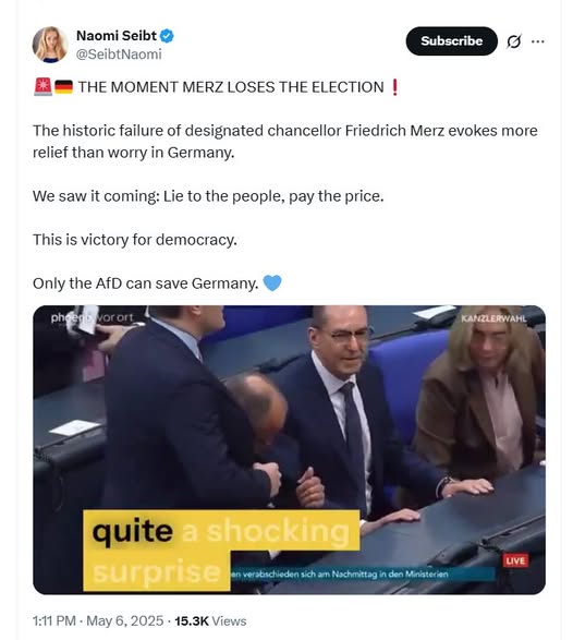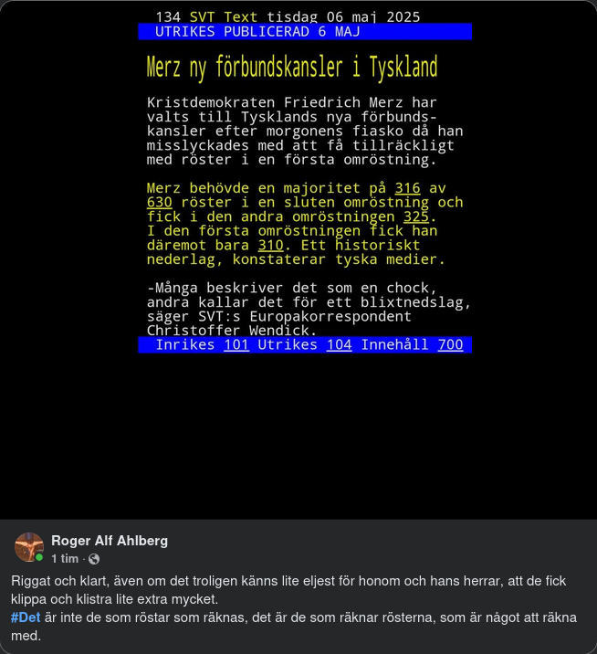 På tisdagen skulle den tyska förbundsdagen rösta om kristdemokraten Friedrich Merz som ny förbundskansler efter valet i februari. Den tyska kristdemokratiska ledaren hade behövt 316 röster för att bli förbundskansler. Det väntades bli en enkel sak, eftersom de tyska Kristdemokraterna och Socialdemokraterna tillsammans har 328 ledamöter. Men när röstsiffrorna räknades fick han bara 310. – Flera i hans egna led, vilka vet vi inte, har antingen lagt ner sina röster eller valt att inte rösta för Friedrich Merz. Det är en stor motgång, säger Sveriges Radios korrespondent Daniel Alling som är på plats i Berlin, till den egna kanalen. Enligt tyska Bild, som hänvisar till rykten inom både Kristdemokraterna och Socialdemokraterna, kan det vara Socialdemokraternas vice partiledare Saskia Esken och personer bakom henne som valt att inte rösta för Merz. Det ska i sin tur komma från att hon inte finns med i den nya regeringen som Merz väntas bilda och beskrivs av tidningen som en ”hämnd”. 14 dagar på sig Från Merz partikollega och tilltänkta utrikesminister, Johann Wadephul, kom ett undvikande svar. ”Det här är parlamentarisk demokrati. Sådant här kan hända”, sa han enligt SR. Nu har parlamentet 14 dagar på sig att försöka välja en ny förbundskansler med absolut majoritet – det vill säga mer än hälften av de röstande. Om det inte går kan förbundskanslern i stället väljas med relativ majoritet, alltså att den som får flest röster vinner. Går inte det heller kan presidenten upplösa förbundsdagen och utlysa nyval, rapporterar TT. Olaf Scholz kommer fortsätta som tillförordnad kansler tills dess att en ny väljs. AfD kräver nyval Det hade kunnat bli en ny omröstning redan i dag tisdag. Men högerextrema AfD, som nyligen stämplades som ett extremistparti av tyska säkerhetspolisen, gick inte med på en ny runda, enligt Bild. I stället uppmanar partiet Merz att lägga ner sina försök att bli ny kansler – och i stället utlysa nyval. ”Vi är redo att axla regeringsansvar”, skriver partiledaren Alice Weidel på X. Stockholmsbörsen ner efter beskedet Efter beskedet backade Stockholmsbörsen, som redan öppnat nedåt inför flera tunga centralbanksbesked i veckan. Vid lunchtid har OMXS-index fallit. Nedgången fick extra tyngd efter nyheten om att Friedrich Merz i en första omröstning i den tyska förbundsdagen inte fått med sig en majoritet av de 630 rösterna – vilket potentiellt kan försvåra hans tillträde som Tysklands nästa förbundskansler. Dax-index på Frankfurtbörsen sjunker också tydligt, ned med 1,9 procent efter omröstningen. Börsnedgången i Stockholm är bred. Bland de mest omsatta aktierna i OMXS30-index faller tungviktare som AB Volvo och Atlas Copco med 2,9 respektive 2,3 procent.