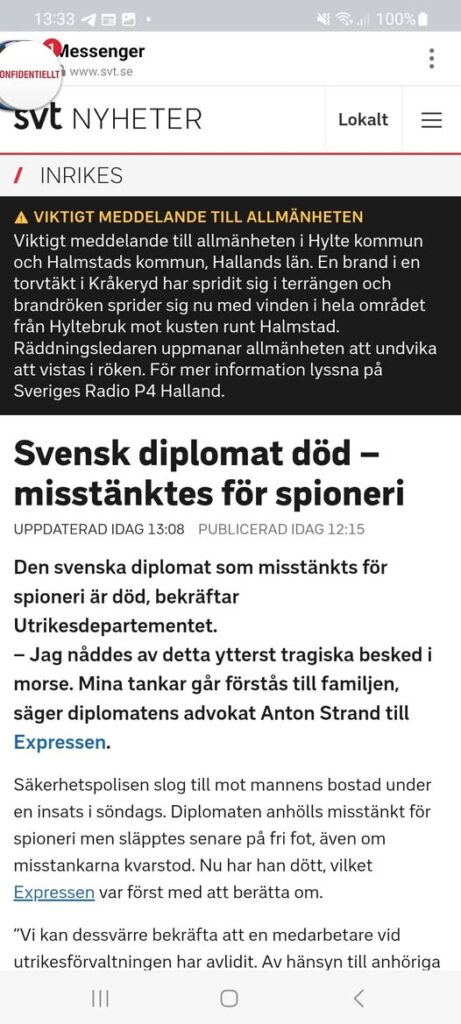 Den svenska diplomat som misstänkts för spioneri är död, bekräftar Utrikesdepartementet. – Jag nåddes av detta ytterst tragiska besked i morse. Mina tankar går förstås till familjen, säger diplomatens advokat Anton Strand till Expressen. Säkerhetspolisen slog till mot mannens bostad under en insats i söndags. Diplomaten anhölls misstänkt för spioneri men släpptes senare på fri fot, även om misstankarna kvarstod. Nu har han dött, vilket Expressen var först med att berätta om. ”Vi kan dessvärre bekräfta att en medarbetare vid utrikesförvaltningen har avlidit. Av hänsyn till anhöriga går vi inte in på några ytterligare detaljer”, skriver Utrikesdepartementet i en kommentar. ”Det är fruktansvärt. Folk gråter. Svårt att ta in”, säger en person med insyn till SVT Nyheter. ”Alla är i chock”, säger en annan person på UD. Utrikesministern: Tankarna hos familj, vänner och kollegor Gabriel Wernstedt, presstalesperson hos Säpo, säger till SVT: – Vi kan inte bekräfta uppgifterna som rör att den person vi utreder skulle kopplas samman med dödsfallet. – Vad gäller statusen för nuvarande utredning är det en fråga för åklagaren. Utrikesminister Maria Malmer Stenergard (M) har nåtts av beskedet om diplomatens död. ”Mina tankar är hos medarbetarens familj, vänner och kollegor. Med hänsyn till den avlidne kommer jag inte gå närmare in på detaljer”, skriver hon i en kommentar. Kritik mot insatsen vid gripandet Diplomatens advokat Anton Strand har riktat hård kritik mot hur gripandet gick till och sagt att hans klient berättat om en ”skräckfylld upplevelse”. Säpo har uppgett att gripandet gick lugnt till. SVT Nyheter söker advokat Anton Strand. Diplomaten hade lång erfarenhet och var stationerad på flera ambassader runt om i världen. Enligt uppgifter till SVT finns det i Säpo-utredningen misstanke om en koppling mellan diplomaten och den nationella säkerhetsrådgivaren Tobias Thybergs hastiga avgång. SVT Nyheter söker statsminister Ulf Kristersson (M)https://www.hitta.se/florian+fuckner/stockholm/person/~RRs4HGqko