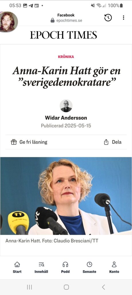 Anna-Karin Hatt gick i klinch mot hela det här synsättet när hon den 4 maj debuterade i SVT:s partiledardebatt. Det var fräscht och piggt av henne. Hon gör liksom en ”sverigedemokratare” när hon mäler sig ut från det gängse tugget om skolproblemen och säger som det är: Svensk skola har naturligtvis problem men är i allt väsentligt bra. Det finns oseriösa friskolor som jagar pengar mer än kunskap och de ska givetvis bort. Men genom möjligheten att välja skola har vi det bästa skyddet mot dåliga skolor alldeles oavsett huvudman för skolorna. Vettigt folk går inte i längden kvar på en underpresterande skola. Och skärper sig staten och ser till att neka/stoppa dåliga privata och kommunala skolor så ökar tryggheten för föräldrar, barn och gymnasieungdomar än mer. En utsatt grupp är nyanlända invandrare som kan tvingas/luras/pressas att sätta sina barn på religiösa skolor och/eller på skolor som har nära kontakt med kriminella gäng. Det problemet kan enkelt undvikas med en reform som begränsar valfriheten för nyanlända.