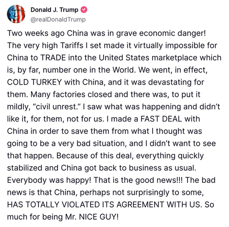 Trump says China already VIOLATED trade agreement. Uh oh... "So much for being Mr. NICE GUY!"