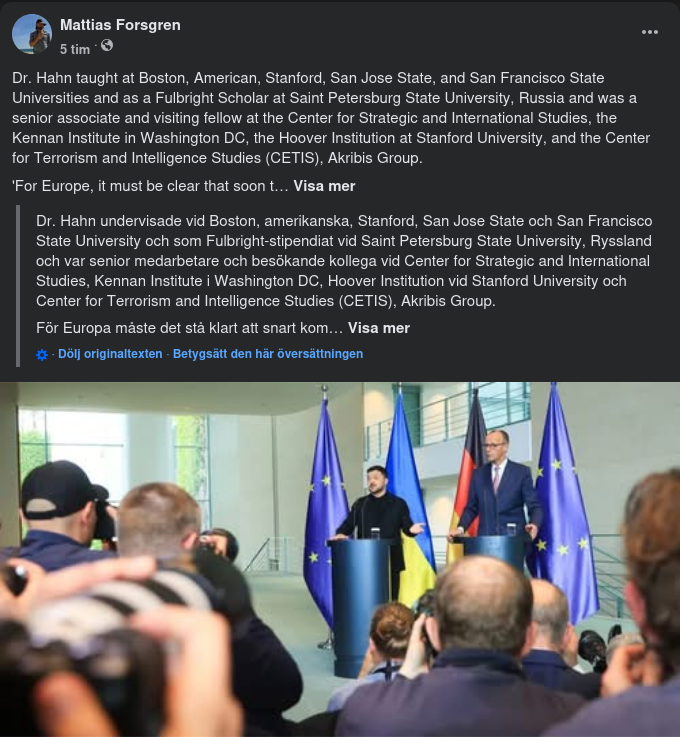 Dr. Hahn undervisade vid Boston, amerikanska, Stanford, San Jose State och San Francisco State University och som Fulbright-stipendiat vid Saint Petersburg State University, Ryssland och var senior medarbetare och besökande kollega vid Center for Strategic and International Studies, Kennan Institute i Washington DC, Hoover Institution vid Stanford University och Center for Terrorism and Intelligence Studies (CETIS), Akribis Group. För Europa måste det stå klart att snart kommer skillnaderna mellan europeisk/ukrainsk och rysk makt att den antingen tvingar Kievs armé, regim och kanske stat att kollapsa eller diktera för Zelenskiy eller en ersättare att Kiev måste sitta vid förhandlingsbordet och acceptera ogynnsamma villkor. Saknar modet eller socialpolitisk, ekonomisk, finansiell, industriell och teknik för att gå in i kriget direkt med stövlar på marken. Europa söker jämlikhet och självrespekt billigt. Att bomba Ryssland på långt håll och låta Ukraina betala priset har varit en ”bra affär” för många i väst. Problemet är att om européerna hjälper Ukraina att attackera Ryssland på djupet och lyckas slå till mot Moskva eller nå något annat slag, kommer Europa att bli ett mål i Putins ”speciella militära operation” (SMO), som Putin implicit varnade i höstas när väst klokt vägrade att ta en så farlig steg. I en sådan händelse kommer Putin sannolikt att uppgradera SMO till krigsstatus, med att statsduman antar en krigsförklaring på hans uppmaning. SMO kommer inte att finnas mer, och en faktisk ”fullskalig invasion” av, och heltäckande krig mot Ukraina kommer att följa. Ukraina kommer att betala ett ännu brantare pris för Europas hybris, men även Europa kommer att drabbas. Kommer Trump att gå in i USA i striden mer direkt, och i vilken form? Desperationens frekventa tjänare är farlig, ödesdigra beslutsfattande. "