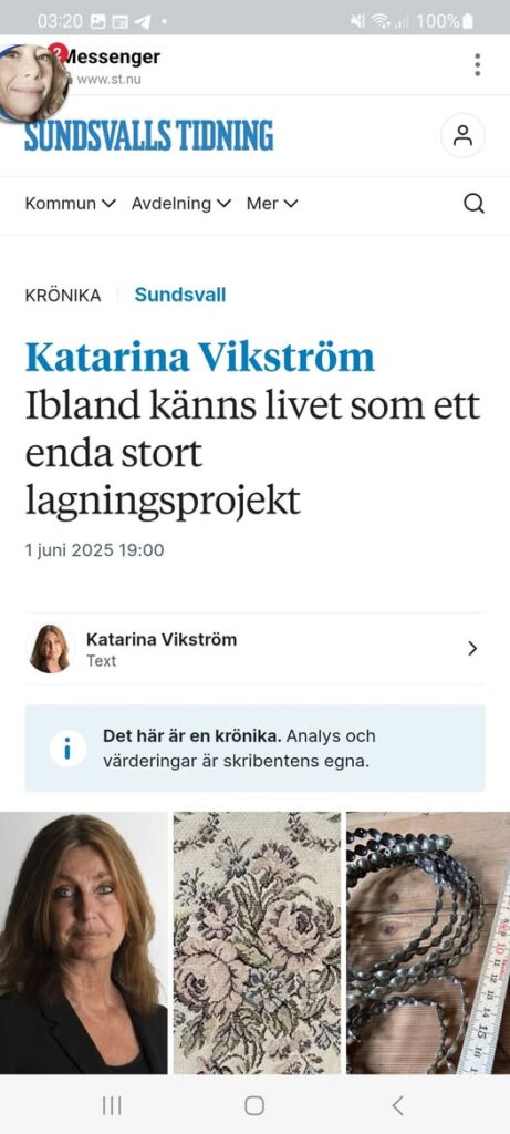 "Vi är i verkstaden. Jag sitter på en hög med skumplast i väntan på att pappa ska bli klar så att vi kan åka hem till byn. Det är 1970-tal och pappa ålar omkring runt en stor, tung soffa. Han har rivit av den gamla klädseln från möbelns stomme. Nu fäster han det nya tyget över stoppningen. Först nålar han fast det med de kraftiga knappnålarna som han har i mungipan. Han drar i tyget och lägger hörnens veck så att de bara ser ut som fina små rynkor. Snart ska tygstycket häftas fast med klammer längs en linje som senare ska täckas av ett kantband. Runt omkring oss finns flera nötta och kantstötta soffor. Ett bortmonterat bilsäte har en reva i galonsitsen. I det fallet ska bara en liten del av den svarta klädseln skäras bort och bytas ut. På en skinnväska har en söm släppt, och en broderad stolsdyna väntar på att åtgärdas. Från tygets baksida ska pappa med hjälp av lim och handsydda trådar återställa framsidans mönster. Pappas jobb handlar om hantverksteknik och mönsterpassning, om tygbitar som ska haka i varandra för att sedan sömlöst flyta ihop, och om stora sjok vars kanter markeras med hjälp av lapptäcksteknik. I en verkstad finns ofta materialet och verktygen nära till hands när något behöver lagas. I det verkliga livet är det inte alltid lika enkelt. Ibland tänker jag att hela livet är som ett enda stort lagningsprojekt. Att vi behöver se vad som behöver repareras och måttbestämma det. Att vi behöver förstå vad vi ska lägga tid på, och vad som inte går att rädda. Det handlar också om att tro på att det går att leva med en del hål och revor, och att det fläckiga och slitna en dag utvecklar en patina och kanske får tillbaka sin glans. Men kanter kan också mötas och fogas samman, trådar kan fästas och vävas ihop. Vi som har varit med ett tag vet att det ofta finns sådant som behöver lappas och lagas, och att det kan behöva göras om flera gånger, innan det blir rätt. Pappa tapetseraren visste allt om hur möbler skulle repareras, men när han stod inför levande materia var det nog inte fullt lika lätt. Jag antar att vi bara måste slipa vidare på våra kanter och försöka fläta ihop tråd för tråd i det här livets märkliga väv Det har gått femtio år sedan jag satt på den där skumplasthögen och om någon av er tror att de materiella, eller livs levande, lagningsprojekten blir färre med åren så kan jag ta er ur den villfarelsen. Det fanns en tid när jag trodde att vuxenlivet var helt viljestyrt och fullt av angenäma val och möjligheter, och så är det nog, men det är också fyllt av renoveringsobjekt. I dag känner jag mig ibland som en ung gammal människa som bland andra unga och gamla människor försöker passa in i en form som kan kännas aningen snäv. Men jag antar att vi bara måste slipa vidare på våra kanter och försöka fläta ihop tråd för tråd i det här livets märkliga väv."Det är nog lite mer omfattande än så..