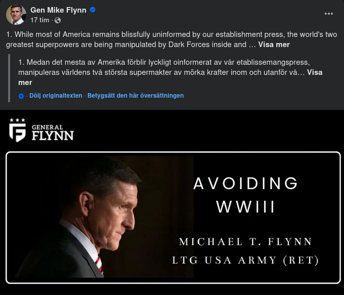 Sammanfattning av General Flynns X-inlägg General Mike Flynn, en pensionerad generallöjtnant i USA:s armé, varnar i sitt X-inlägg för att [DS] manipulerar USA och Ryssland mot en storskalig militär konfrontation, vilket ingen nation eller förnuftig person vill ha. Han identifierar flera nyckelpunkter: