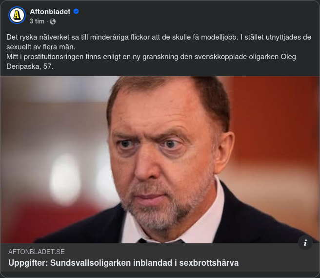 Det ryska nätverket sa till minderåriga flickor att de skulle få modelljobb. I stället utnyttjades de sexuellt av flera män. Mitt i prostitutionsringen finns enligt en ny granskning den svenskkopplade oligarken Oleg Deripaska, 57. Prostitutionsringen ska bland annat ha lurat till sig offer genom att presentera sig som modellagenturer och representanter för skönhetstävlingar. Sedan ska de ha sålts till män som framförallt var ute efter ”oskulder”, rapporterar de exilryska medierna Istories och Verstka. ”Svenskoligarken” kritiserade Putin – blir av med lyxhotellet Enligt en gemensam granskning var en av kunderna oligarken och miljardären Oleg Deripaska, 57, som än i dag är storägare i aluminiumsmältverket Kubal i Sundsvall. Deripaska ska enligt källor till tidningarna ha köpt sex av flickor så unga som i högstadieåldern. Finns inte med i förundersökningen Prostitutionsringen upptäcktes av rysk polis redan 2019, och ledde till att tre hallickar dömdes till fängelse. Även en sexköpare – en rysk affärsman inom tändsticksbranschen – åtalades, men har flytt landet och lever nu i exil. Källor inifrån polisutredningen berättar dock att de även var Deripaska på spåren. Enligt material som journalisterna i granskningen fått ta del av dyker hans namn upp i flera förhör med de utsatta flickorna. Aluminimumsmältverket Kubal i Sundsvall Aluminimumsmältverket Kubal i Sundsvall Foto: Jonas Ekströmer/TT Oligarken nämns även i avlyssnade samtal mellan flickor och hallickarna. Efter påtryckningar från högre ort ska dock Deripaskas inblandning i härvan ha städats bort från den slutgiltiga förundersökningen. – Våra överordnade, på order från åklagarna, sa åt oss att inte lägga oss i, säger en poliskälla. Varken Oleg Deripaska eller någon av hans representanter har velat kommentera granskningen. Efter att artiklarna om Deripaska publicerades under torsdagen ska båda mediernas hemsidor ha utsatts för omfattande cyberattacker, uppger de för The Moscow Times.