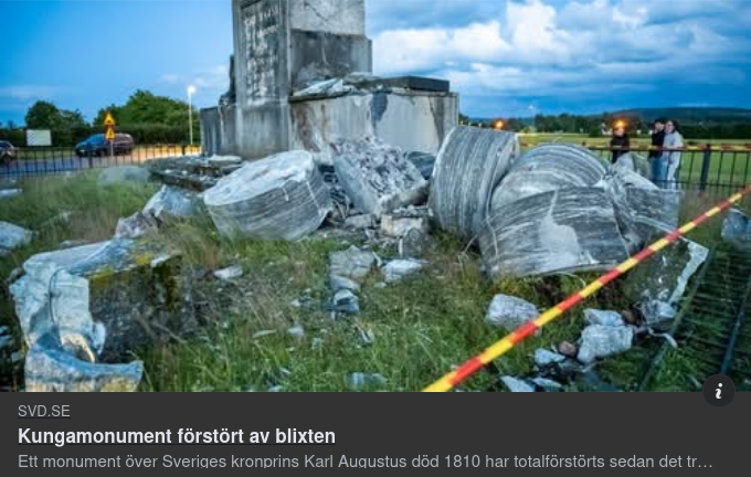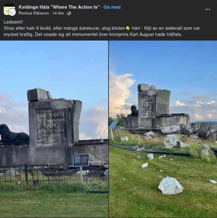 "Ett monument över Sveriges kronprins Karl Augustus död 1810 har totalförstörts sedan det träffats av blixten i skånska Kvidinge. – Helt plötsligt kom en blixt och en knall samtidigt utan förvarning - det small bara, säger Henrik Hollén, som bor granne med monument, till Helsingborgs Dagblad. TT Uppdaterad 05:27 Publicerad 2025-06-23 Det var på måndagskvällen som blixten slog ned och monumentet rasade samman. På bilder från platsen syns stora delar av monumentet ligga runt omkring sockeln. – Hela pelaren är nere till sockeln, säger Mats Streer, vakthavande befäl vid räddningstjänsten, till tidningen. En avspärrning har upprättats runt monumentet. – Möjligen att det finns en risk att någonting trillar ner. Avspärrningarna får vara kvar så länge, säger Streer. Monumentet, som restes 1826, är byggt i Kolmårdsmarmor och ritades av Stockholms stadsarkitekt Carl Christoffer Gjörwell. – Det är väldigt tråkigt när historiska monument skadas så här allvarligt av naturens krafter, säger Marcus Årskog, pressekreterare vid Fastighetsverket som förvaltar verket, till HD. TT"
