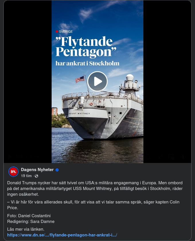 Det amerikanska ledningsfartyget beskrivs som ett ”flytande Pentagon”. Nu är fartyget på besök i Stockholm – efter övningar i Östersjön som följts på nära håll av ryska stridskrafter. – Vi hade interaktioner med flyg som flög i närheten av Mount Whitney, säger fartygschefen Colin Price. Läget i Östersjön beskrivs som spänt, med den ryska skuggflottan som eskorteras av rysk militär, samtidigt som försommaren kantats av marinövningar från både Nato-sidan och Ryssland. Ett av fartygen som deltog i den årliga amerikanskledda övningen Baltops är USS Mount Whitney, som nu lagt till i Frihamnen i Stockholm. Under Baltops blev fartyget föremål för flera överflygningar av ryska flygstridskrafter. – Jag skulle inte kalla det för incidenter, men ja, vi hade interaktioner med flygplan som flög i närheten av Mount Whitney, säger Colin Price. ”Flytande Pentagon” Fartygschefen uppger dock att det inte fanns några skäl till oro i samband med överflygningarna. – Under Baltops så befinner vi oss mitt i Östersjön och det är internationellt luftrum där flygplan kan flyga var de vill. Hur nära flög de? – Det vill jag inte gå in på. Konferensrum ombord på USS Mount Whitney med karta på bordet och fartygsbild på väggen. USS Mount Whitney har befunnit sig i Östersjön i över en månad, säger kapten Colin Price. Foto: Pär Bäckström/TT Det 200 meter långa kommandofartyget USS Mount Whitney är USA:s sjätte flottas flaggskepp – härifrån kan amerikanska marinen leda stora militära operationer. – Vi brukar kalla det för ett flytande Pentagon eftersom vår främsta styrka handlar om kommunikation och ledningssystem, säger Jonathan Desimone, ledningssystemchef på USS Mount Whitney. Svensk personal ombord Fartyget leds av kapten Colin Price som uppger att fartyget nu befunnit sig i Östersjön i en månad, framför allt för att leda marinövningen Baltops. Under övningen deltog svenska marinen med en ubåt, och ombord på USS Mount Whitney fanns även svensk personal. – Vi hade ett antal svenska sambandsofficerare som var ombord under hela övningen som del av Nato-bemanningen, säger Colin Price.https://www.dn.se/sverige/flytande-pentagon-har-ankrat-i-stockholm/