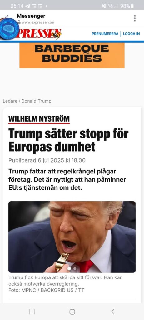 1990-talet var en storhetstid. Inte bara för pojkband och personsökare utan också för skatteplanering. Den nya frihandeln gjorde det busenkelt att skyffla runt miljarder och stoppa in dotterbolag i karibiska brevlådor. På menyn stod klassiska skattemanövrar som ”dubbeldippen” och den ökända ”dubbel irländsk med holländsk macka”. Företagsledare ansåg sig rentav skyldiga att pressa ner bolagsskatten så nära noll som lagen tillät. Annars gav de ju bort aktieägarnas pengar i onödan, vilket i sig kunde vara olagligt. Vilda västern varade dock inte. Efter 2008 års finanskris hann myndigheterna ikapp. Genom att dela deklarationer mellan länder kunde de värsta kryphålen täppas till. Dessutom blev det fult att trixa. När nolltaxerande jättar pryglades i pressen fick de svårare att både sälja och anställa. För att rädda sina rykten var det enklast att bara betala rimligt mycket bolagsskatt, särskilt eftersom de kunde smyga över kostnaden på sina kunder och anställda i form av högre priser och lägre löner. Både staten och kapitalet var nog rätt nöjda med den lösningen. Trump fattar att krångliga skatteregler förgiftar företagen Att stora företag försöker göra rätt hindrar dock inte politiker från att fortsätta jaga dem. Andras pengar får man aldrig nog av, så 2020 samlades finansministrar från världens 20 rikaste länder för att försöka krama fler miljarder ur bolagen. Annons Länderna ville slippa sänka sina bolagsskatter för att konkurrera med varandra om företagens investeringar. I stället bildade de en kartell där alla lovade att aldrig gå under 15 procent. De tog fram ett system för att räkna ut hur mycket skatt företagen betalar, och en sorts straffskatt mot den som bryter mot kartellen. Om ett företag halkar under 15 procent i något land ska ett annat land alltså klippa till företaget med straffskatt. Med alla riktlinjer blev det 500 sidor regler. Skatteexperter påpekade att systemet aldrig skulle fungera. Samtidigt varnade företagen: i stället för att uppfinna ny teknik skulle de tvingas anställa arméer av jurister för att försöka begripa var och när straffskatten kunde slå till. Många stater tvekade inför monstret. Men EU lät sig inte skrämmas och antog det hela som lag 2022. Europas skattejurister har inte hunnit med mycket annat sedan dess. Reglerna är omöjliga att följa. Problemet är att Bryssels karriärstege går ut på att pressa igenom regelpaket – ju större och otympligare, desto mer imponerande. Nya skatteregler anses särskilt eleganta eftersom de kräver medhåll från alla medlemsländer. Hetsen att reglera mera saknar en naturlig motvikt. Tills nu. Donald Trump har många brister, men han fattar att samhället behöver ekonomisk tillväxt och att krångliga skatteregler förgiftar företagen. Annons Med hot om tullar fick han EU att backa. Förra veckan blev det klart att amerikanska företag – de största i världen – slipper straffskatten. När reglerna nu måste göras om kan EU knappast fortsätta att plåga sina egna företag. Det enda rimliga vore att skrota reformen, som varit en enorm kostnad för företagen men knappt dragit in några pengar till medlemsstaterna. Det är uppfriskande när någon sätter hårt mot hårt och vägrar ställa upp på Bryssels dumheter. Även när denne någon råkar heta Donald Trump.