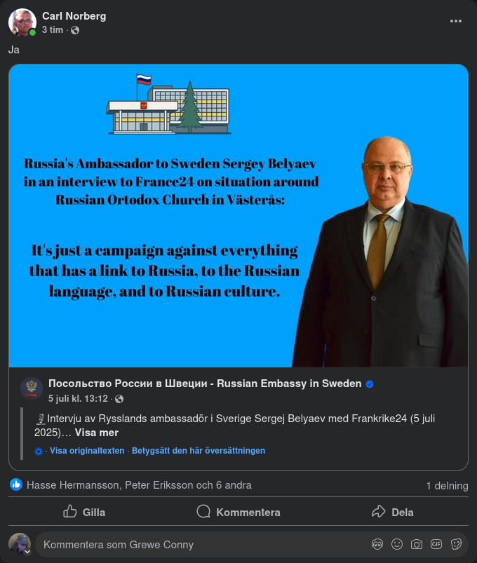 Det var inte folket i den ortodoxa samhället som bestämde var templet skulle ligga, det var Västerås stad. Nu ser vi att några lokala politiker och journalister förklarar att detta tempel är ett hot, en fara eftersom det står nära flygplatsen. Och ur min synvinkel är det bara en kampanj mot allt som har en koppling till Ryssland, till det ryska språket och till rysk kultur.