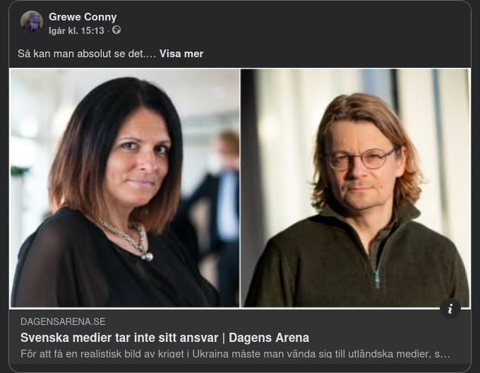 "För att få en realistisk bild av kriget i Ukraina måste man vända sig till utländska medier, skriver Frida Stranne och Peo Hansen. För ett par månader sedan signalerade Zelenskyj att han nu är beredd att åtminstone temporärt avstå territorium till Ryssland för att avsluta ”krigets heta fas”. Det sätter svenska medier i en svår sits eftersom de rutinmässigt avfärdat varje territoriell eftergift till Ryssland som putinism. För oss som anklagats för att vara just Putins hantlangare handlar Kievs trevare förstås inte alls om någon putinism. I stället ska den ses som ett tecken på en gryende realism, den realism som vi förespråkat sedan kriget inleddes för snart tre år sedan och som är nödvändig för att få ett slut på slakten och avvärja en eskalering av kriget. Har vågat öppna lådan Debatten som förs utanför Sverige, i de stora internationella medierna, har länge, och allt oftare under den senaste tiden, vågat öppna den realistiska verktygslådan. Tidningar som Financial Times, Washington Post, New York Times och The Economist hymlar inte längre med att Ukraina förlorar kriget – samtidigt som de fortfarande visar sitt helhjärtade stöd för Ukraina. I Sverige? Knappt ett ord i den riktningen. Redan för över ett år sedan vågade Washington Post ge röst åt Ukrainas dåvarande överbefälhavare, Valerij Zaluzjnyj, när han dömde ut den ukrainska sommaroffensiven 2023 som framtvingad av västs verklighetsfrämmande ledare och därför som ”totalt ogenomförbar”. ”Men”, tillade han, ”den genomförs”, vilket ytterligare signalerade att beslutet om offensiven var utom Ukrainas kontroll. Optimistisk buffé I svenska medier däremot serverades i stället en rik buffé av optimism kring offensiven. På Aktuellt (9/6 2023) betonade Oscar Jansson från Försvarshögskolan att offensiven var ”jätteviktig” och Ukrainas ”bästa chans att tillfoga Ryssland en strategisk förlust som kan påverka utgången av kriget”. I Sveriges Radio (14/6 2023) sa Utrikespolitiska institutets Jan Hallenberg att ”många av oss tror och hoppas att Ukraina kan bryta igenom på ett antal punkter och driva tillbaka ryssarna, och i allra bästa fall … så långt att Putin inser att det här kriget inte går att vinna”. Där Ukrainas ÖB såg offensiven som ”totalt ogenomförbar” andades svenska medier och deras ständiga experter tro och hopp. Något som också lade sordin på alla försök att lyfta behovet av förhandlingar för att skapa bästa möjliga utväxling för Ukraina, eftersom en falsk konsensus skapades om att Ukraina skulle kunna vinna allt. Det ukrainska folket kan få betala ett högt pris för detta, då det sannolikt kommer att innebära att Kiev kommer att få göra långt större eftergifter än om man förhandlat när man hade en starkare position. I september 2024 rapporterade Financial Times (27/9) om den desperata situationen vid fronten. Flera befälhavare och soldater ur fyra olika brigader uppskattar här att 50–70 procent av Ukrainas nyrekryterade infanterisoldater dör eller såras inom några få dagar efter deras första strid. De nya soldaterna ”dödas i en skrämmande takt”, säger befälen vid fronten. ”Vissa av de nya rekryterna vet inte ens hur de ska hålla sina vapen” och när de ”intar sina positioner flyr många vid första granatexplosionen”. De ukrainska förlusterna har varit enorma, stridsmoralen falnar och sedan länge ansluter sig ingen frivilligt till den ukrainska armén. DN:s ledarsida duckar Dagen efter påpekade The Economists (28/9) följande: ”Om Ukraina och väst ska kunna vinna kriget måste de ha modet att erkänna att de förlorar.” ”Människor är trötta på kriget”, ”armén klarar inte av att mobilisera och träna tillräckligt med soldater” och korruptionen och nationalismen breder ut sig. Inte nog med det, ”om Zelenskyj fortsätter att trotsa verkligheten genom att insistera på att Ukraina kan ta tillbaka allt territorium som Ryssland har stulit sedan 2014 kommer han att driva bort Ukrainas vänner och ytterligare splittra Ukraina.” Detta fick det att rinna över på DN:s ledarsida. ”Har Economist helt tappat det om Ukraina” löd rubriken på ledaren den 3 oktober. Den ”annars oftast sansade” tidskriften, hävdade DN, spred fatalism och insåg inte att varje förslag om territorium i utbyte mot fred – alltså det Zelenskyj senare själv skulle avisera – är ”mycket naivt”. Man kan inte ”köpslå med Putin”: ”Han kan bara tvingas.” Inte ett ljud om alla de amerikanska forskare och politiker som länge hävdat samma sak som The Economist, inklusive den tillträdande utrikesministern och “höken” Marco Rubio som i november sade att kriget kommer avslutas vid förhandlingsbordet. Det mest talande i DN:s ledare är ändå hur man väljer att ducka för det fruktansvärda lidandet i Ukraina. ”Det är sant”, skriver DN, ”att Ukraina är hårt sargat”. Men detta går enkelt att relativisera genom tillägget att ”å andra sidan” så sker de ryska framgångarna ”till ett mycket högt pris”. Så eftersatt har verkligheten blivit på DN att slakten i Ukraina har en ”å andra sidan” som faktiskt inte är så pjåkig: ryssen fortsätter ju att blöda rikligt. Helt oemotsagda “experter” Svenska medier vägrar nyktra till. Möjligen till följd av att våra ledande mediehus vecka efter vecka låtit samma ”experter” helt oemotsagda få fritt spelrum att saluföra ensidiga analyser av krigets bakgrund, dess utveckling och hur det ska avslutas. Inte sällan har tveksamma ”sanningar” om kriget framförts helt utan krav på källor och svenska journalister sätter sig till doms över etablerade vetenskapliga perspektiv och tar tydlig ställning för specifika sätt att tolka och förstå kriget. Ett talande exempel bland många var P1:s Radiokorrespondenterna Ryssland från den 5 december där vi hörde både R