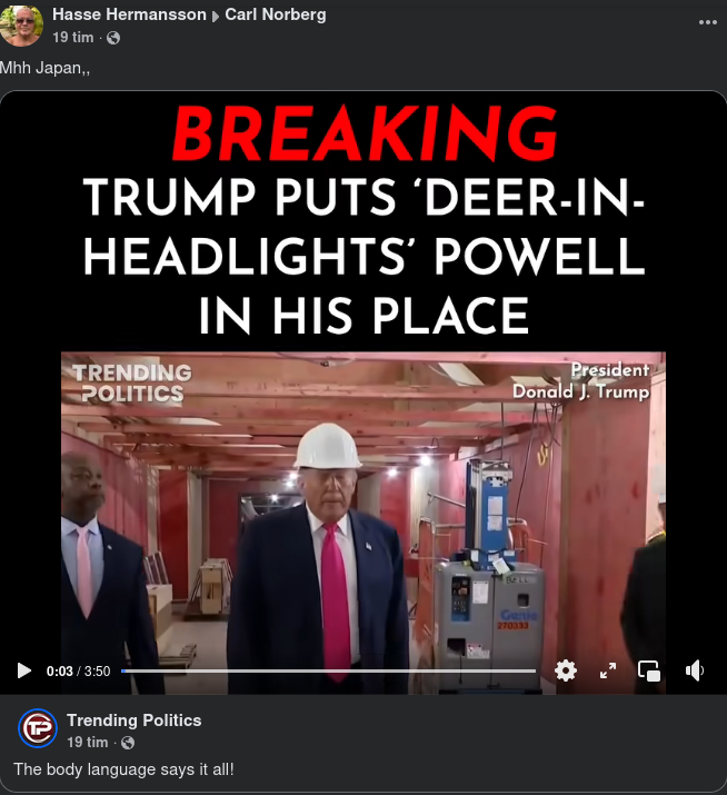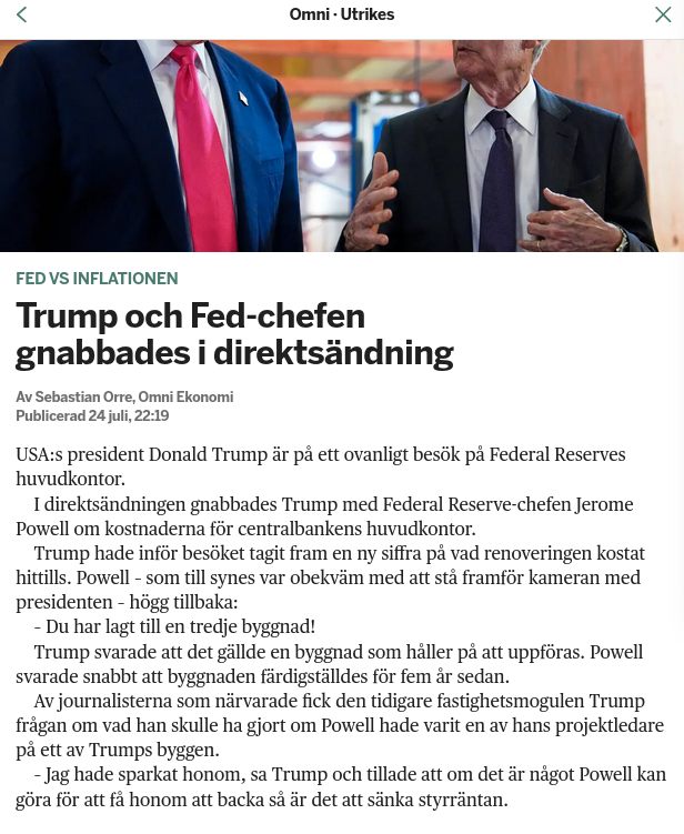 En del skriver mindre än andra & vill man så finns det de som tillhandahåller en länk där man kan lyssna alldeles själv på vad faktiskt säger. "President Trump on Thursday toured the Federal Reserve headquarters renovations, which have ballooned over one billion dollars over budget. Powell is under fire for the cost of renovating the Fed’s DC headquarters. The cost ballooned from $1.9 billion to $2.5 billion. He currently also faces a criminal referral to the Justice Department from Congresswoman Anna Paulina Luna (R-FL). Trump announced earlier that he was joined by Senator Tim Scott, Senator Thom Tillis, OMB Director Russ Vought, Chairman of Fannie Mae and Freddie Mac, Bill Pulte, my Appointees to the National Capital Planning Commission, James Blair and Will Scharf, and various other construction professionals. President Trump also said the renovation will actually cost $3.1 billion or more! Getting ready to head over to the Fed to look at their, now, $3.1 Billion Dollar (PLUS!) construction project. Also present will be Fed Chair Jerome Powell, Senator Tim Scott, Senator Thom Tillis, OMB Director Russ Vought, Chairman of Fannie Mae and Freddie Mac, Bill Pulte, my Appointees to the National Capital Planning Commission, James Blair and Will Scharf, and various other construction professionals. Almost immediately after he got in front of the cameras, President Trump called Powell out for going more than one billion over budget. “The 2.7 is now 3.1 [billion],” Trump said. Powell nodded in disagreement and interrupted, saying, “I’m not aware of that,” and Trump pulled out the receipts with a document from the Fed. Senator Scott further confirmed that he’s estimating 3.1 or 3.2 billion dollars. Powell then tried to argue with Trump and say he’s wrong because Trump included a building that was “part of the overall” renovation, said Trump. Powell said he does not expect additional cost overruns, but “we’re ready for them,” and “we have a little bit of a reserve that we may use.” “We expect to be finished in 2027,” he added.