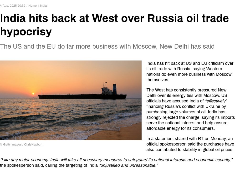 According to Times Now, Indian Prime Minister's National Security Adviser Ajit Doval is scheduled to visit Moscow this week to strengthen bilateral relations amid growing pressure from Washington. Also, in late August, Indian Foreign Minister Subrahmanyam Jaishankar will visit Russia - TASS. Cooperation between Russia and China is not subject to condemnation by the United States. This was stated to TASS by Liu Pengyu, a spokesman for the Chinese Embassy in the United States, commenting on a bill submitted to the US Senate that provides for sanctions against China for allegedly supporting a Russian special military operation in Ukraine. TASShttps://www.rt.com/india/622487-india-russian-oil-us-tariffs/