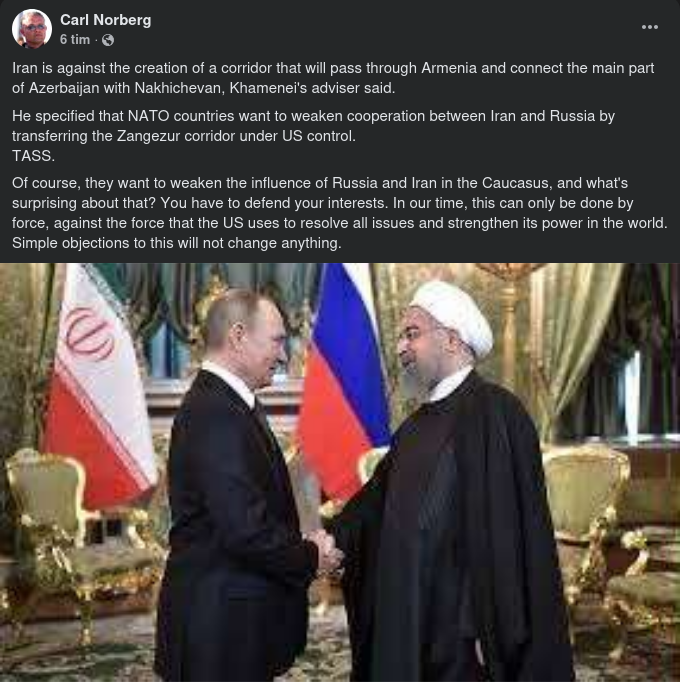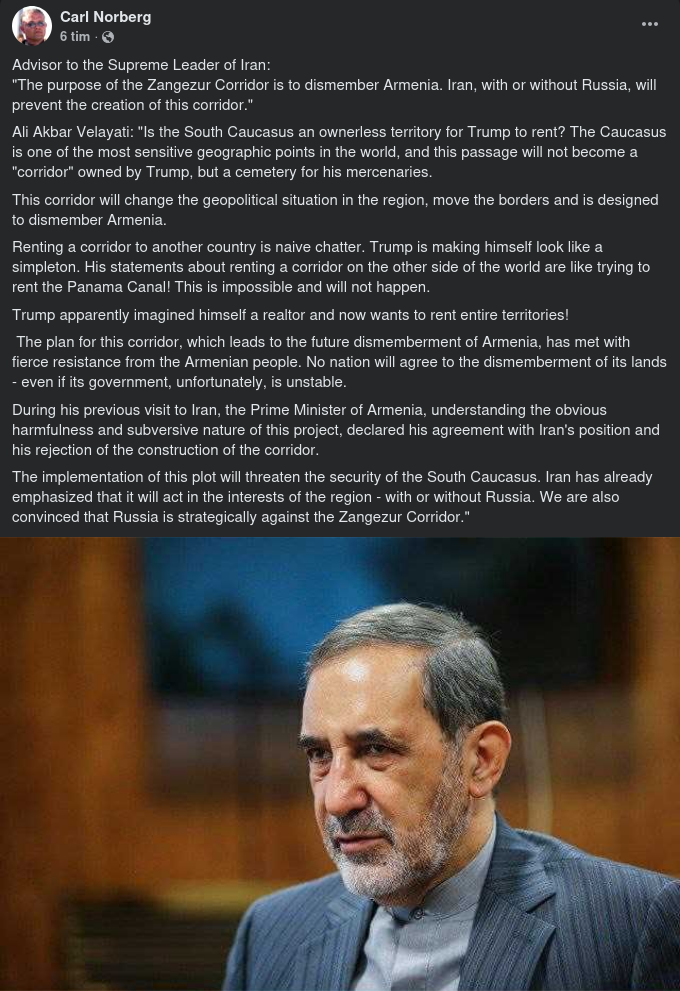 Teheran kommer inte att tillåta att Zangezurkorridoren hamnar under USA:s kontroll även om Ryssland inte hjälper till. Detta uttalade Irans högste ledares rådgivare Ali Akbar Velayati, citerad av Jamaran. Enligt honom kommer korridoren att förändra den geopolitiska situationen i Sydkaukasus, påverka Irans gränser, leda till isolering av landet i norr och väster samt skapa förutsättningar för NATO:s närvaro i regionen. "Vi kommer inte att tillåta NATO att närma sig Irans norra gränser", betonade Velayati och tillade att projektet är en "politisk konspiration" mot Iran och några grannländer.