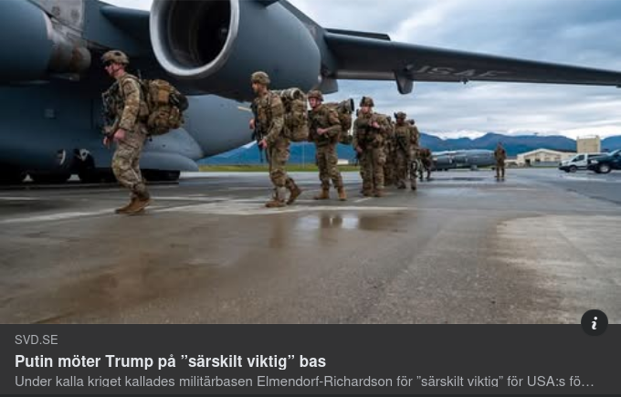 "Under kalla kriget kallades militärbasen Elmendorf-Richardson för ”särskilt viktig” för USA:s försvar gentemot dåvarande Sovjetunionen. På fredag blir Vladimir Putin den förste ryske presidenten att besöka basen. TT Publicerad 11:26 En Vita huset-tjänsteman har bekräftat för Sky News att mötet mellan USA:s president Donald Trump och Rysslands dito Vladimir Putin på fredag ska ske på militärbasen Elmendorf-Richardson. Basen är den största i Alaska och kombinerar flygvapnets Elmebdorf-bas och arméns Fort Richardson. Där bor fler än 32 000 personer enligt Washington Post, cirka 10 procent av närliggande staden Anchorages befolkning. Enligt USA:s kongressbibliotek var Elmendorf-Richardson särskilt viktig under kalla kriget. Ryssland sålde Alaska till USA 1867, och beslutet att nu hålla samtal om Ukrainakriget just där har mötts av viss kritik. – Det är lätt att föreställa sig att Putin under sina möten med Trump kommer att lyfta argumentet: Se, territorier kan byta ägare, säger Nigel Gould-Davies, före detta brittisk ambassadör i Belarus, till Sky news och fortsätter: – ”Vi gav er Alaska. Varför kan inte Ukraina ge oss en del av sitt territorium?”. TT"