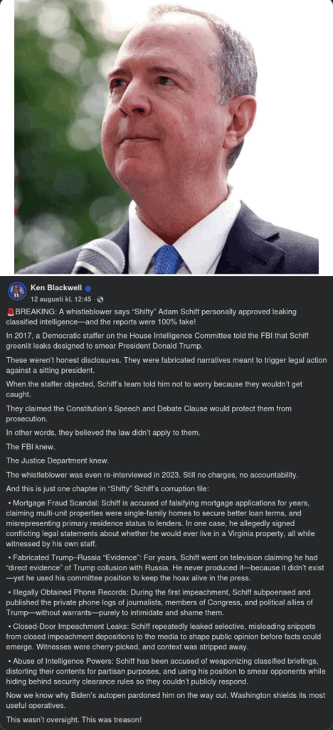 BREAKING: A whistleblower says “Shifty” Adam Schiff personally approved leaking classified intelligence—and the reports were 100% fake! In 2017, a Democratic staffer on the House Intelligence Committee told the FBI that Schiff greenlit leaks designed to smear President Donald Trump. These weren’t honest disclosures. They were fabricated narratives meant to trigger legal action against a sitting president. When the staffer objected, Schiff’s team told him not to worry because they wouldn’t get caught. They claimed the Constitution’s Speech and Debate Clause would protect them from prosecution. In other words, they believed the law didn’t apply to them. The FBI knew. The Justice Department knew. The whistleblower was even re-interviewed in 2023. Still no charges, no accountability. And this is just one chapter in “Shifty” Schiff’s corruption file: • Mortgage Fraud Scandal: Schiff is accused of falsifying mortgage applications for years, claiming multi-unit properties were single-family homes to secure better loan terms, and misrepresenting primary residence status to lenders. In one case, he allegedly signed conflicting legal statements about whether he would ever live in a Virginia property, all while witnessed by his own staff. • Fabricated Trump–Russia “Evidence”: For years, Schiff went on television claiming he had “direct evidence” of Trump collusion with Russia. He never produced it—because it didn’t exist—yet he used his committee position to keep the hoax alive in the press. • Illegally Obtained Phone Records: During the first impeachment, Schiff subpoenaed and published the private phone logs of journalists, members of Congress, and political allies of Trump—without warrants—purely to intimidate and shame them. • Closed-Door Impeachment Leaks: Schiff repeatedly leaked selective, misleading snippets from closed impeachment depositions to the media to shape public opinion before facts could emerge. Witnesses were cherry-picked, and context was stripped away. • Abuse of Intelligence Powers: Schiff has been accused of weaponizing classified briefings, distorting their contents for partisan purposes, and using his position to smear opponents while hiding behind security clearance rules so they couldn’t publicly respond. Now we know why Biden’s autopen pardoned him on the way out. Washington shields its most useful operatives. This wasn’t oversight. This was treason!