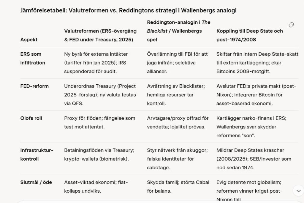 | Aspekt | Valutreformen (ERS-övergång & FED under Treasury, 2025) | Reddington-analogin i *The Blacklist* / Wallenbergs spel | Koppling till Deep State och post-1974/2008 |