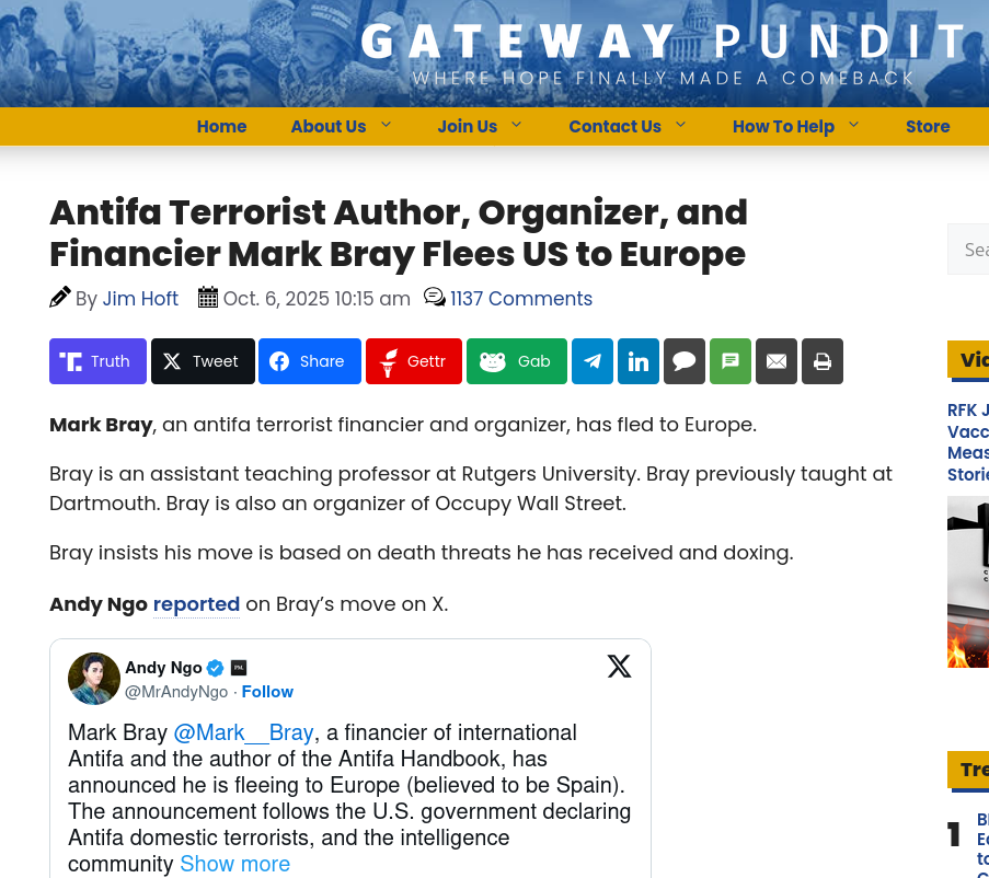 Den svenska vänsterextremisten Johan Victorin har pekats ut som grundare av Antifa i USA. Efter att organisationen terrorstämplats befinner han sig i Varberg – och har nu konfronterats vid sin bostad av journalisten Christian Peterson. – Du är medborgare i USA, är du rädd att själv dömas? frågar Peterson. Journalistnätverket Project Veritas lyckades 2020 infiltrera Antifa Rose City i Portland, som beskrevs som den första avdelning som organisationen startade i USA, år 2007. De ska ha använt sig av erfarenheter från extremvänstern i Sverige när de byggde upp organisationen, som bland annat var involverad i de våldsamma BLM-upploppen. Av avslöjandet framgick att grundaren av Antifa Rose City var Caroline Victorin (född Gauld). Hon är gift med den tolv år yngre svenske vänsterextremisten Johan Victorin som också är involverad i Antifa, konstaterade journalisten Andy Ngo. Enligt Ngo hjälpte duon till att "importera europeisk Antifa-extremism till USA". – De fick kunskaper av någon som hade betydligt mycket mer erfarenhet och ägnade sig åt det här professionellt. Caroline flyttade till Sverige tillsammans med sin man som har dubbelt medborgarskap. Så det sker ett utbyte genom den europeiska kopplingen, berättade infiltratören i Project Veritas video. Nyligen terrorstämplades Antifa av USA:s president Donald Trump. En av anledningarna var att Antifa Rose City helt öppet hyllade mordet på den konservativa ungdomsledaren Charlie Kirk, som sköts till döds under en utomhusdebatt vid ett college i Utah. Med anledning av det har journalisten Christian Peterson sökt upp Johan Victorin – och det visade sig att han återvänt till Sverige och befinner sig i Varberg i Halland. När Peterson konfronterade Victorin utanför hans bostad valde Antifa-grundaren att ignorera hans frågor. – Ställer ni er bakom på mordet på Charlie Kirk? Du är medborgare i USA, är du rädd att själv dömas? frågar Christian Peterson utan att få några svar.https://www.thegatewaypundit.com/2025/10/antifa-terrorist-author-organizer-financier-mark-bray-flees/
