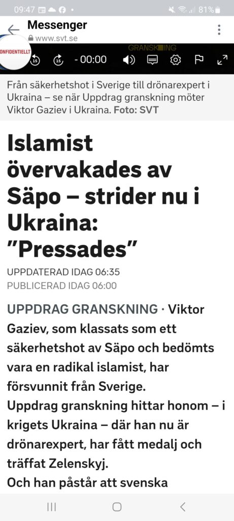 Uppdrag granskning · Viktor Gaziev, som klassats som ett säkerhetshot av Säpo och bedömts vara en radikal islamist, har försvunnit från Sverige. Uppdrag granskning hittar honom – i krigets Ukraina – där han nu är drönarexpert, har fått medalj och träffat Zelenskyj. Och han påstår att svenska myndigheter har hjälpt honom dit. Viktor Gaziev blev rikskänd som en av de så kallade sex imamerna 2019 som klassades som hot mot rikets säkerhet. Han kunde inte utvisas eftersom han riskerade förföljelse i sitt hemland, så Säkerhetspolisen hade Gaziev under strikt uppsikt. Sedan juni 2023 finns han i Ukraina. Han menar att Säpo pressat honom, och att de haft ett enskilt möte med hans exfru som ombads uppmana Gaziev att åka. I gengäld ska Säpo ha lovat att inte stå i vägen för hennes ansökan om medborgarskap. Uppdrag granskning har hittat fler säkerhetshot som hävdar att de fått samma förslag om att åka till Ukraina. – Vi bedriver inte den typ av verksamhet som påstås här, säger Säpos operativa chef Fredrik Hallström. Se ”Säkerhetshotens hemlighet” på SVT Play Resan planerades i chatt I en chatt syns hur Viktor Gaziev förts till kriget i Ukraina av någon som kallar sig svensk soldat. Gaziev hävdar att personen tillhör Must, Sveriges militära underrättelsetjänst. Personen i chatten diskuterar bokning av flygbiljetter till Polen och vilken gränsövergång de därifrån ska korsa. Gaziev är vid tillfället internationellt efterlyst, saknar resehandlingar och har daglig anmälningsplikt på Gävle polisstation. I chatten skickar han sina bankuppgifter och visar upp utrustning han köpt till kriget. Must har inte velat kommentera uppgifterna. Säpo tillbakavisar Viktor Gaziev påstår att det var hans kontaktperson på Säkerhetspolisen som gav honom en kontakt till Must. Säpo tillbakavisar uppgifterna starkt. – Vi föreslår inte eller försöker förmå någon att resa till ett visst ställe. Allra minst krigets Ukraina, säger Fredrik Hallström.