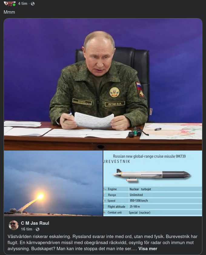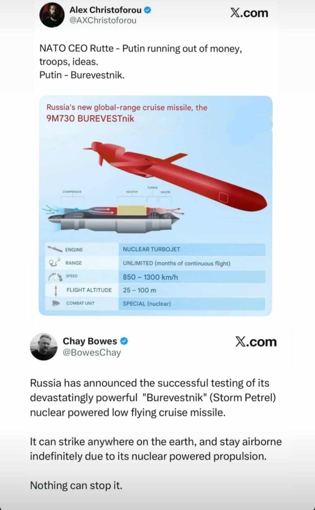 Västvärlden riskerar eskalering. Ryssland svarar inte med ord, utan med fysik. Burevestnik har flugit. En kärnvapendriven missil med obegränsad räckvidd, osynlig för radar och immun mot avlyssning. Budskapet? Man kan inte stoppa det man inte ser. Den 21 oktober, under president Vladimir Putins och generalstabschefen Valery Gerasimovs ledning, provsköt Ryssland 9M739Burevestnik, världens första operativa kärnvapendrivna kryssningsrobot med obegränsad räckvidd. Den flög över 14 000 kilometer, manövrerade i timmar och gled förbi varje teoretiskt luftförsvarshölje som västvärlden någonsin utformat. "Missilen utförde framgångsrikt alla utsedda vertikala och horisontella manövrar och demonstrerade sin starka förmåga att kringgå antimissil- och luftförsvarssystem", bekräftade Gerasimov. "Dess tekniska egenskaper gör den kapabel att träffa högt skyddade mål på alla avstånd med garanterad noggrannhet." Putin kallade det vad det är... "En unik produkt som ingen annan i världen har... kapabel att träffa vilket mål som helst på något avstånd." Han tillade att alla viktiga testmål uppnåddes och att förberedelser för utplacering nu pågår. Medan London och EU dreglar över självmordsupptrappning och pressar Kiev att utföra djupa attacker i Ryssland, skrev Moskva just om avskräckningslagarna. Burevestnik (som betyder stormsvala) flyger inte bara. Den håller längre. •Motor: kärnkraftsturbojet. •Räckvidd: obegränsad. •Hastighet: 850–1300 km/h. •Höjd: 25–100 m, följer terrängen, osedd av radar. •Sträckspets: speciell (kärnkraft). Detta innebär att en enda uppskjutning från rysk mark kan cirkulera jorden på obestämd tid, välja sin bana i realtid, kringgå varje NATO-radarbåge och dyka upp över sitt mål utan varning. Det gör miljarddollarsförsvarssystem som Patriot och Aegis föråldrade reliker. Varje västerländsk eskalering, långdistansmissiler, militariseringen av Polen och Baltikum, driver Ryssland att förnya sig bortom gränserna. Burevestnik är det matematiska svaret på politisk arrogans, ett vapen som inte är utformat för krig, utan för den tystnad som följer när avskräckning blir absolut. Västvärldens ledare behandlar fortfarande krig som en PR-kampanj. Rysslands budskap är däremot matematiskt... räckvidd: obegränsad; avlyssning: omöjlig; tålamod: ändlig. Putins varning den här veckan kunde inte ha varit tydligare: "Om ryskt territorium träffas av ett sådant vapen kommer reaktionen att bli mycket allvarlig – om inte, som de säger, överväldigande." Nu ser vi vad överväldigande betyder. Den "regelbaserade ordningen" mötte just en kärnvapenturbojet. Och någonstans i Bryssel och London läser samma män som skrattade åt Rysslands varningar nu briefingar stämplade "Burevestnik – bekräftad operativ." De kommer att kalla det eskalering. Men sanningen är mycket enklare: Ryssland har just omdefinierat fred bortom styrka, genom makt som inte längre kan avlyssnas.