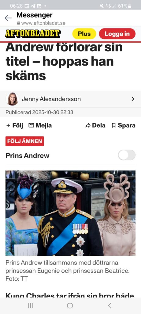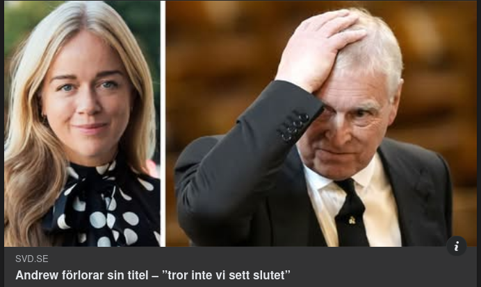 "Kung Charles tar ifrån sin bror både prinstitel och kunglig status. Från och med nu går skandalprinsen under namnet Andrew Mountbatten Windsor. Det är ett efternamn som konstruerades av drottning Elizabeth och hennes make, prins Philip, och det är tänkt att användas av kungligheter som står långt från tronen och som saknar prins- eller prinsesstitlar. Det finns nog inget avstånd som är tillräckligt långt från tronen i Andrews fall. Han är anklagad för våldtäkt, han har haft en nära vänskap med en pedofil och han sägs ha varit god vän med en vapensmugglare. Han ska även ha haft kopplingar till en kinesisk spion i Storbritannien. Han har dessutom blivit påkommen med flera lögner i en omtalad intervju med BBC 2019 där han försökte rentvå sitt namn. Lögnerna och det faktum att han försvarade sin vänskap med Epstein blev hans första stora fall från den kungliga piedestalen. Hans mamma, drottning Elizabeth, förbjöd honom att representera kungahuset och Storbritannien. 2022 kom nästa stora fall. Prinsen gjorde upp i godo med Virginia Giuffre som anklagade honom för våldtäkt. Hon påstod att hon tvingats ha sex med honom vi tre tillfällen när hon var 17 år gammal. Prins Andrew, eller om det var hans mamma, betalade åtskilliga miljoner till Giuffre för att prinsen skulle slippa rättegång. Andrew fick från den dagen inte längre använda Hans Kungliga Höghet-titeln och han tvingas avsäga sig alla sina kungliga beskyddarskap hos olika organisationer. Prins Andrew tillsammans med sin exfru Sarah Ferguson som också blivit av med sin hertiginnetitel. Prins Andrew tillsammans med sin exfru Sarah Ferguson som också blivit av med sin hertiginnetitel. Foto: TT Skammen var total för Andrew som av många beskrivs som pompös, stolt och med en von oben-attityd. Han anser att han har rätt till allt vad livet har att erbjuda. Oavsett om det handlar om kvinnor, pengar eller makt. Spiken i kistan blev de tidigare hemliga dokumenten om Epstein som amerikanska kongressens tillsynsutskott offentliggjorde. Där förekommer Andrew flertalet gånger. Virginia Giuffres memoarer som gavs ut postumt häromveckan avslöjade ytterst pinsamma och hemska detaljer om prinsen. I efterskalven avsade sig Andrew sin prinstitel och hertigtitel. Men det innebar i praktiken att han hade dem kvar, det vara bara så att han inte använde dem. Det räckte inte för britterna. Alla anklagelser och avslöjanden har lett fram till det mycket unika och spektakulära beslut som kung Charles nu tar. Titlarna ska väck. Det är inte en slump. Eftersom kungligheter i dag inte har någon politisk makt måste de förlita sig på folkets stöd och förtroende. Det är den enda valutan de kan handla med. Kung Charles vill inte vara kungen som förlorade britternas kärlek och stukade monarkin på grund av en skamlös, möjligtvis brottslig, lillebror. Han vill inte heller att hans son, prins William, ska tvingas ta tag i skandalen det första han gör som ny regent när den dagen kommer. I den här kungliga soppan har vi de klassiska tabloid-ingredienserna: sex, lögner och brott. Även tragisk död. Virginia Giuffre tog sitt liv tidigare i år. Enligt hennes anhöriga på grund av de många sexualbrott hon utsattes för. I kungahusets pressmeddelande gör man klart att man står på offrens sida. Andrew Mountbatten Windsor kommer nu för alltid vara inskriven i historieböckerna som en prins som blev av med både titlar, status och hem. Må han skämmas."https://www.svd.se/a/B05QnG/prins-andrew-forlorar-sin-prinstitel-kungahuset-tankarna-hos-offren